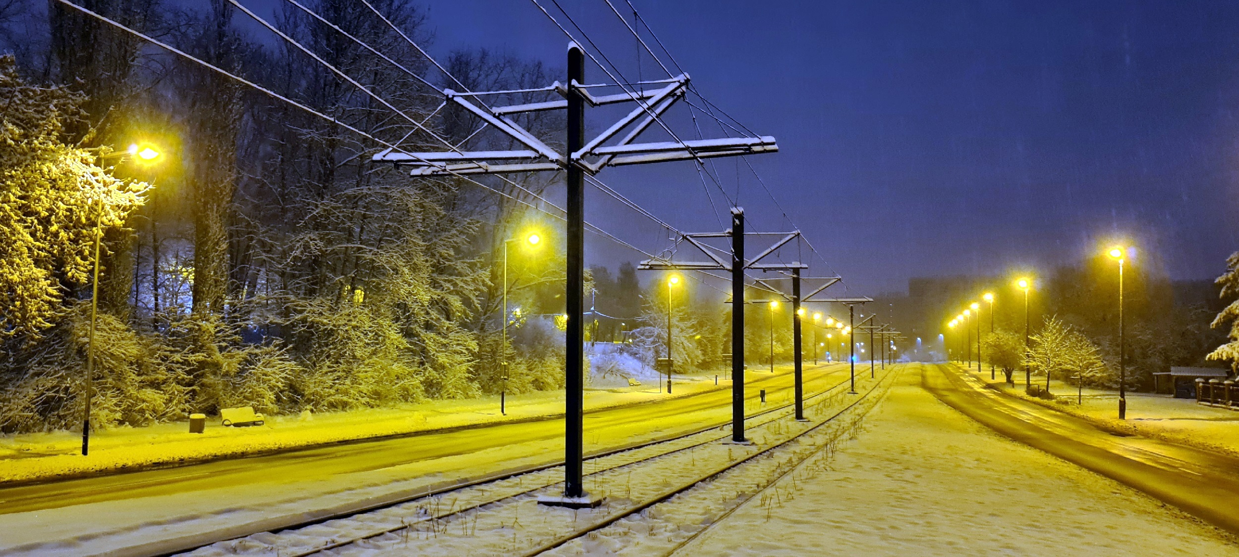 Czekam na pierwszy tej doby, rozkładowy przejazd tramwaju. Ślady na torach i sieci trakcyjnej sugerują, że „przecierak” już tu był, i nie powinno być komplikacji. (Kraków, Piaski Nowe, 2026-02-15) |