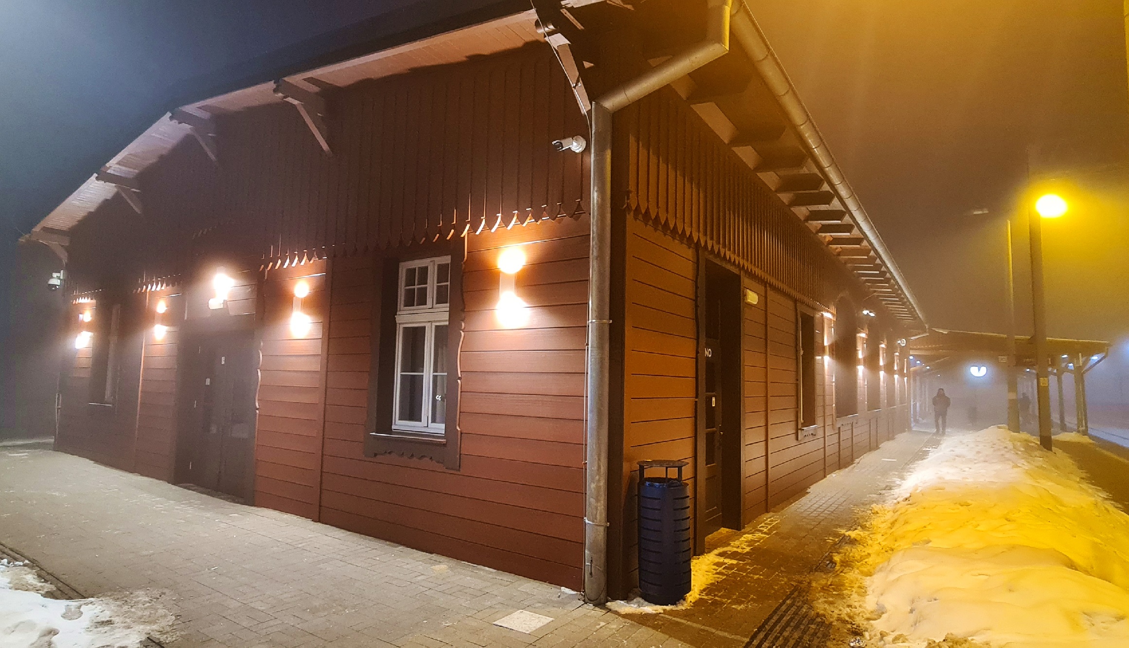 4 Peron, czyli mieszczące się we wschodnim skrzydle dworca lokalne, centrum wystawienniczo/kinowo/konferencyjne, powstałe pod patronatem Miejskiego Ośrodka Kultury, Sportu i Aktywności Lokalnej. Widok z peronu 1, od wschodniej strony. (Szklarska Poręba Górna, 2026-02-04) |
