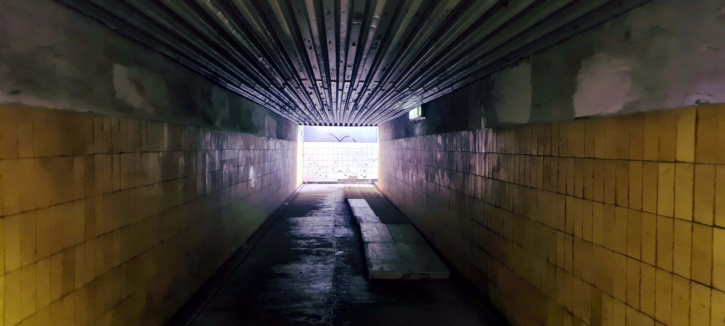 Stary tunel pod stacją. Widok w kierunku południowym), ujęcie z miejsca wyjścia na perony przez nastawnię dysponującą. (Katowice Zawodzie, 2026-02-22) |