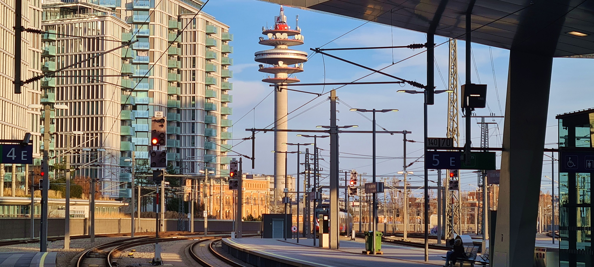 Peron 5/6, kraniec wscjodni. W tle górująca nad okolicą wieża przekaźnikowa A1. (Wien Hauptbahnhof, 2026-02-26) |