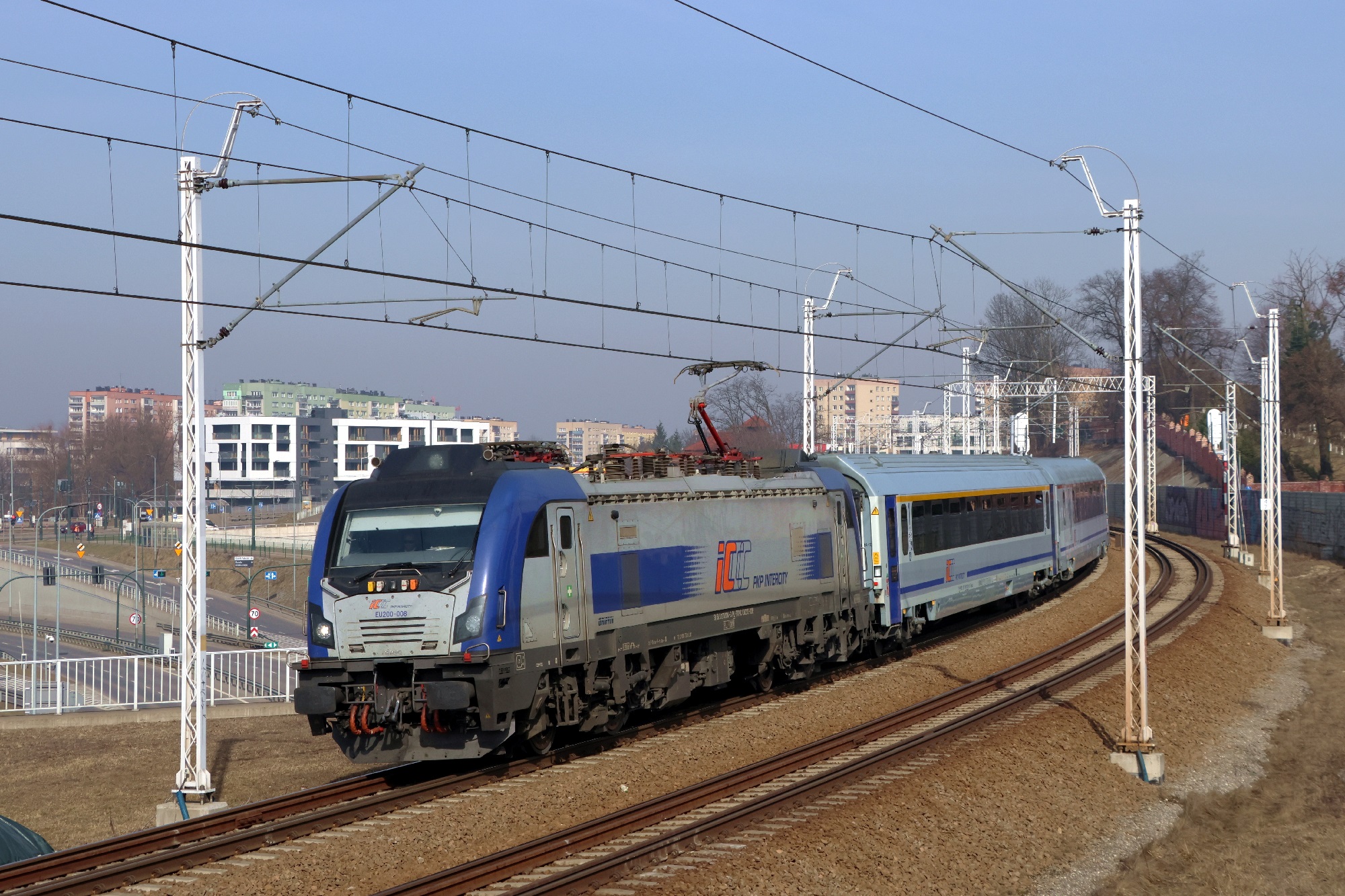 EU200-008 na czele składu pociągu EIC1350 „Tatry”, relacji Warszawa Wschodnia – Zakopane, przejeżdża nad Trasą Łagiewnicką. (Kraków, 2026-03-08) |