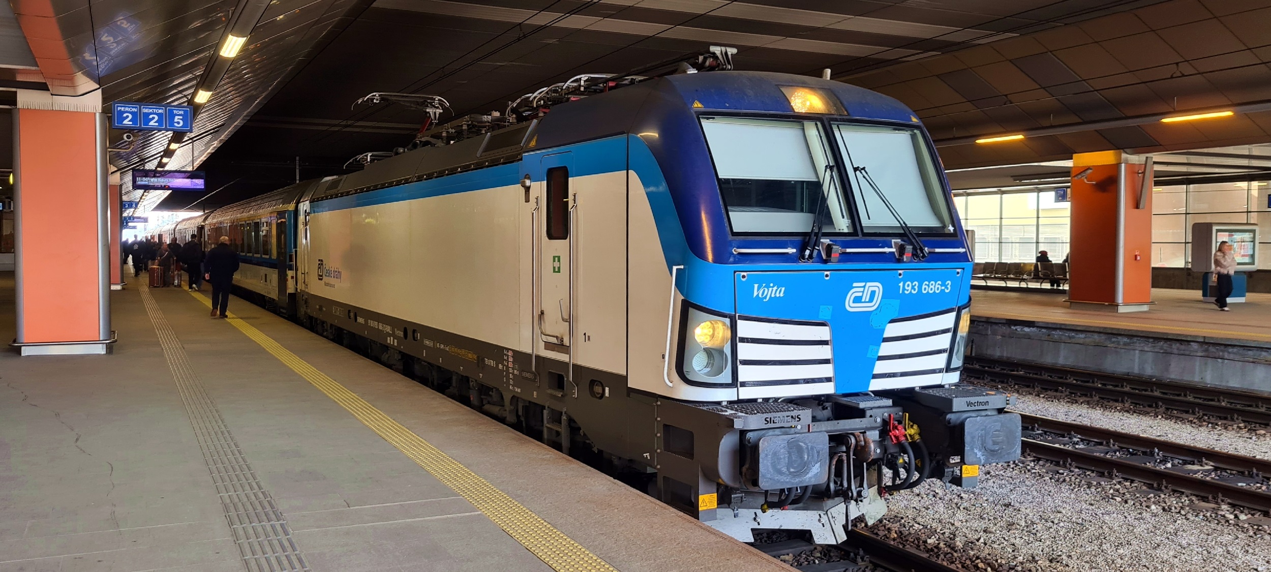 193 686-3 na czele składu pociągu 34008/114 „Cracovia”, relacji Kraków Główny – Praha hl. n. (Kraków Główny, 2026-03-08) |