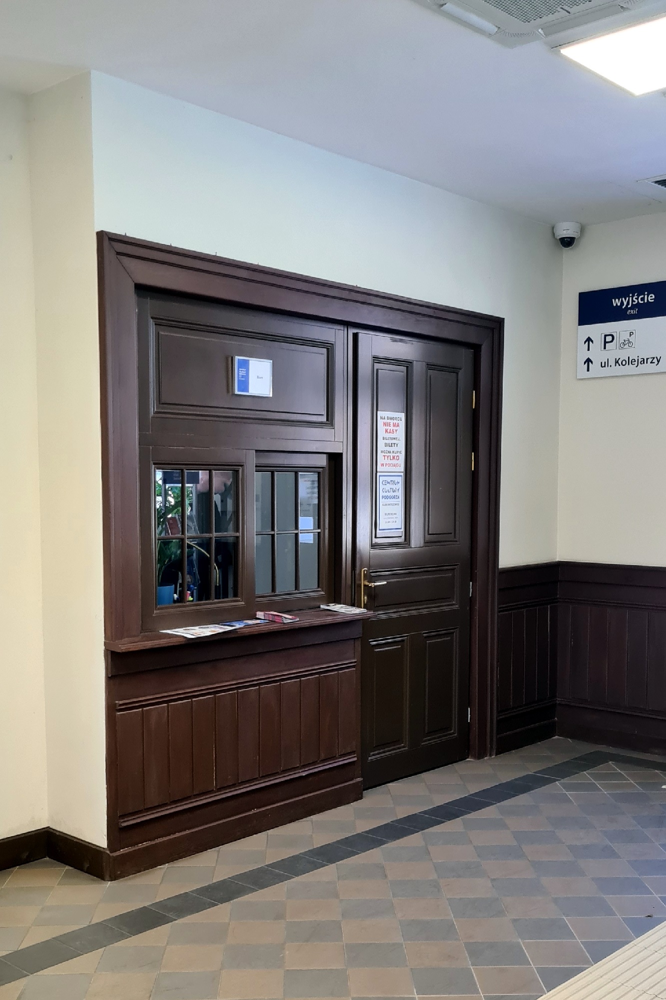 Pieczołowicie odrestaurowane okienko kasowe. Żaden z przewoźników obsługujących stację nie zechciał prowadzić tu kasy. W zamian, na zewnątrz budynku ustawiono biletomat. Pomieszczenie kasowe zaś zajmuje Klub Swoszowicki. Sąsiadujące z nim pomieszczenie przewidziane na punkt handlowo-usługowy takoż. (Kraków Swoszowice, 2026-03-09) |