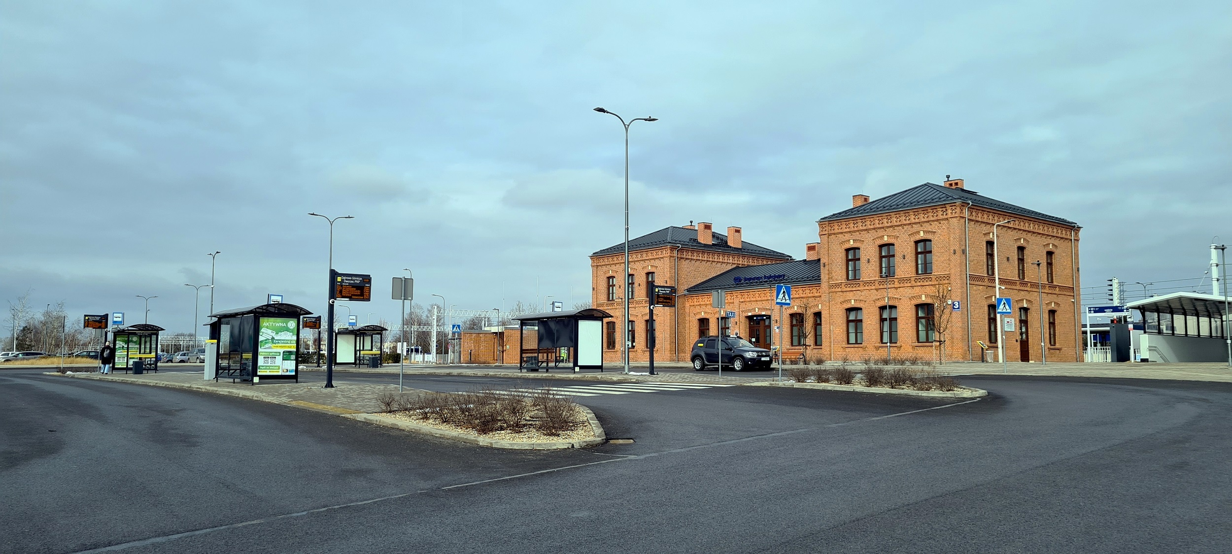 Stacja Dąbrowa Górnicza zasługuje na miano pełnoprawnego węzła przesiadkowego. Przed budynkiem dworca znajduje się postój taksówek i stanowiska dla autobusów. Po jego lewej stronie budynek zadaszonego parkingu dla rowerów. W sąsiedztwie (niewidoczne w kadrze) znaleźć można jeszcze dwa parkingi, dla rowerów i aut. (Dąbrowa Górnicza, 2026-02-22) |