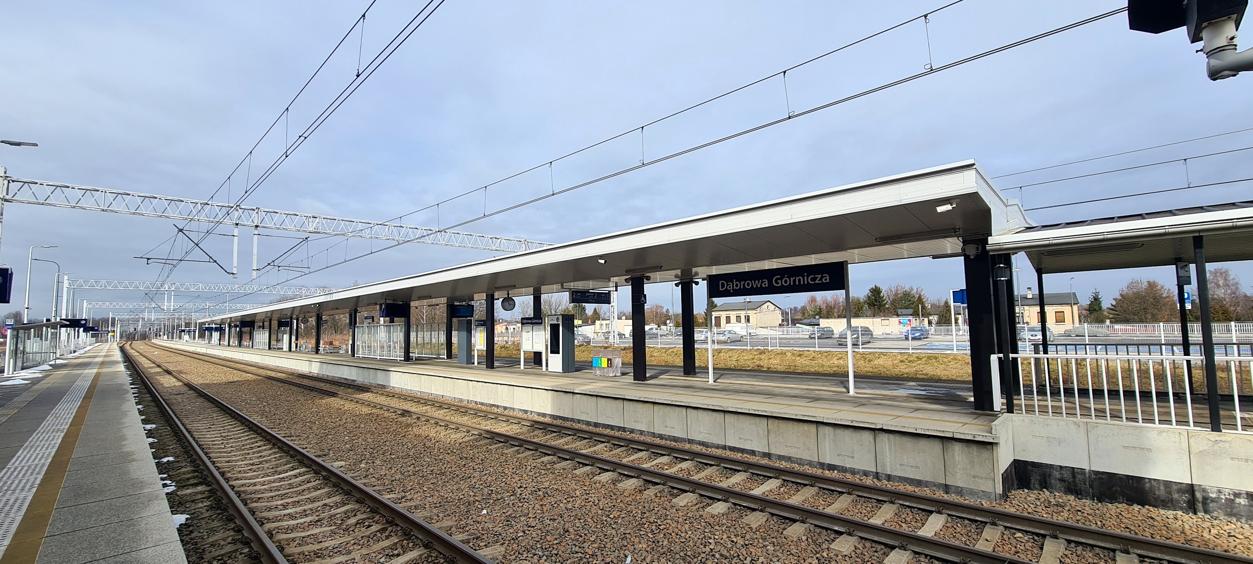 Peron 2, za nim parking samochodowy i rowerowy po północnej stronie stacji. (Dąbrowa Górnicza, 2026-02-22) |