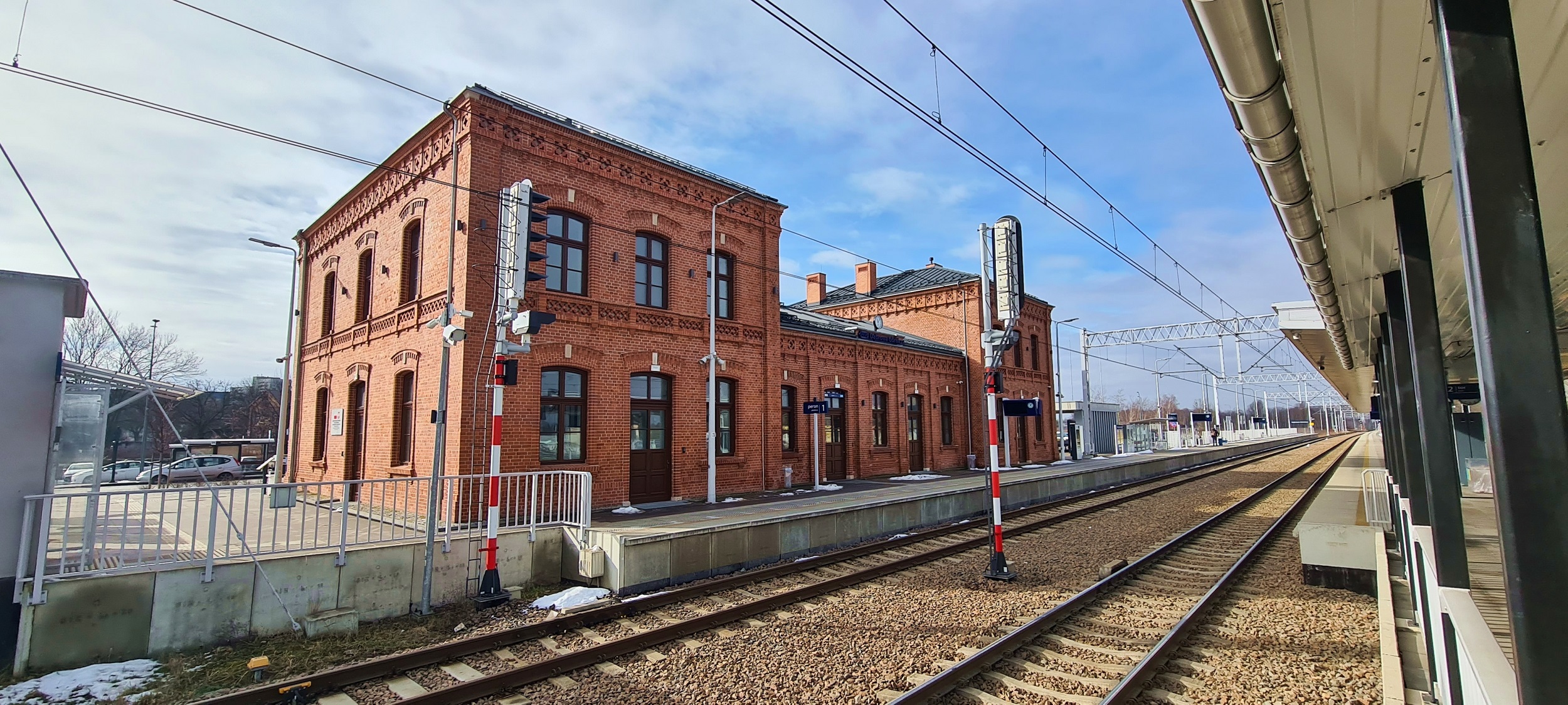 Widok z peronu 2 na peron 1 i budynek dworca. (Dąbrowa Górnicza, 2026-02-22) |