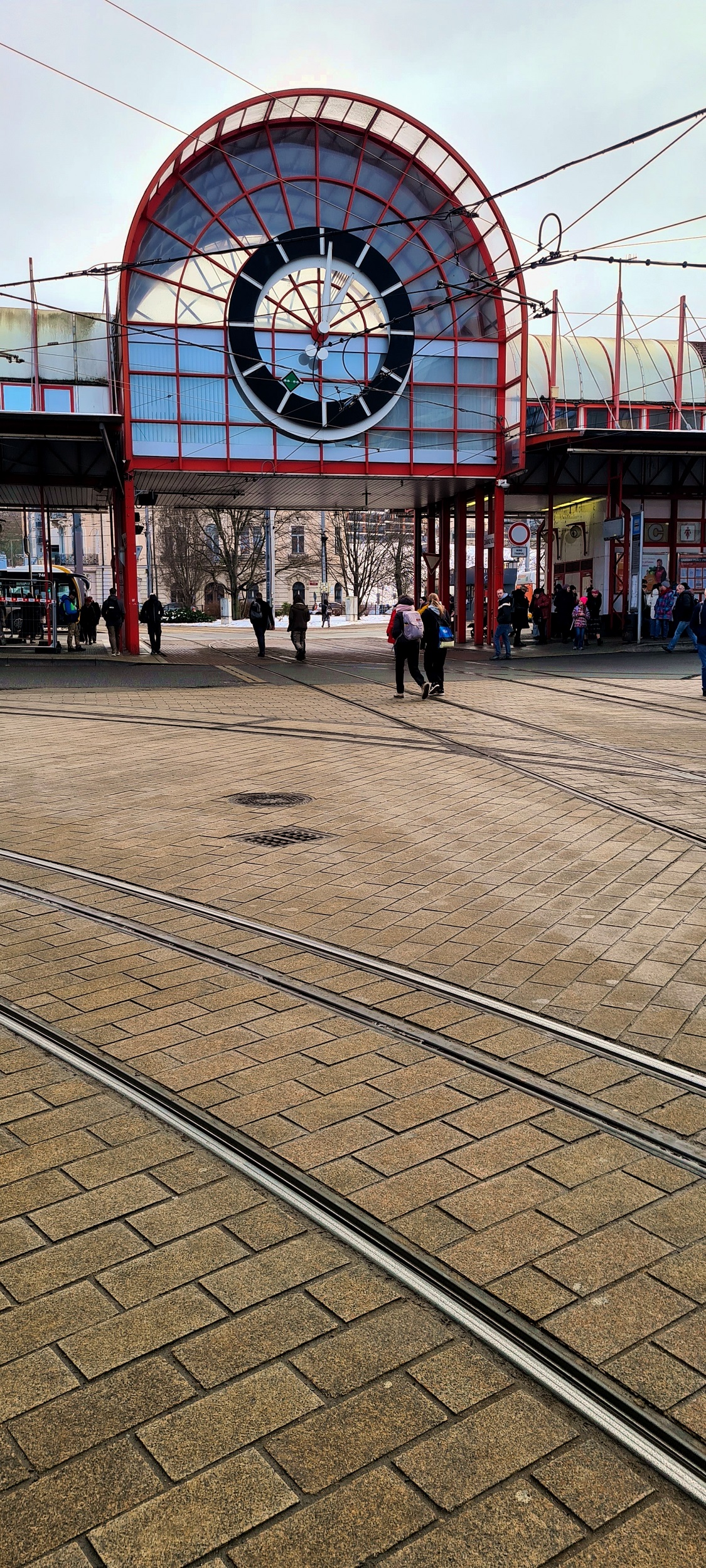 Terminal węzła przesiadkowego Fügnerova, strona północno-zachodnia. W nawierzchni relikty czasów, gdy po mieście poruszały się jednocześnie tramwaje wąsko i normalnotorowe. (Liberec, 2026-02-04) |