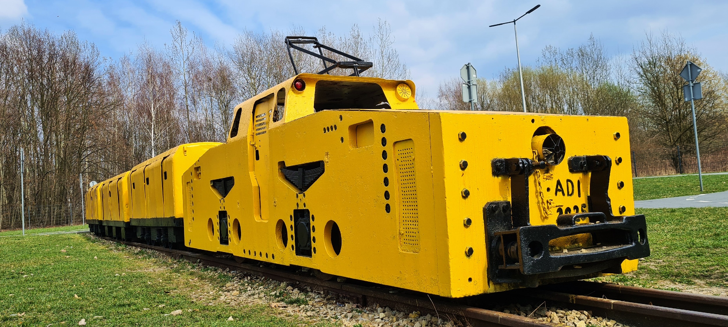 Lokomotywa dołowa Ld31 ze składem wozów kopalnianych do transportu pracowników, ustawiona na terenie miasteczka ruchu drogowego, przy ulicy Kolberga. (Ruda Śląska, 2026-03-24) |
