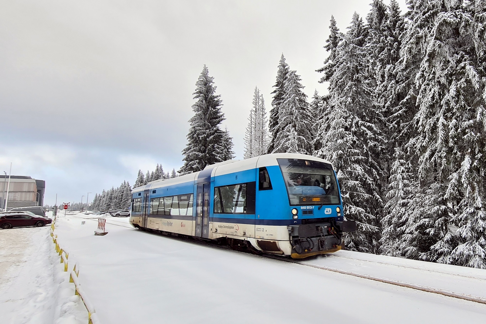 840 013-7 jako pociąg KD2663 ze Szklarskiej Poręby Górnej do Liberca, odjeżdża w stronę Harachova. (Polana Jakuszycka, 2026-02-03) |
