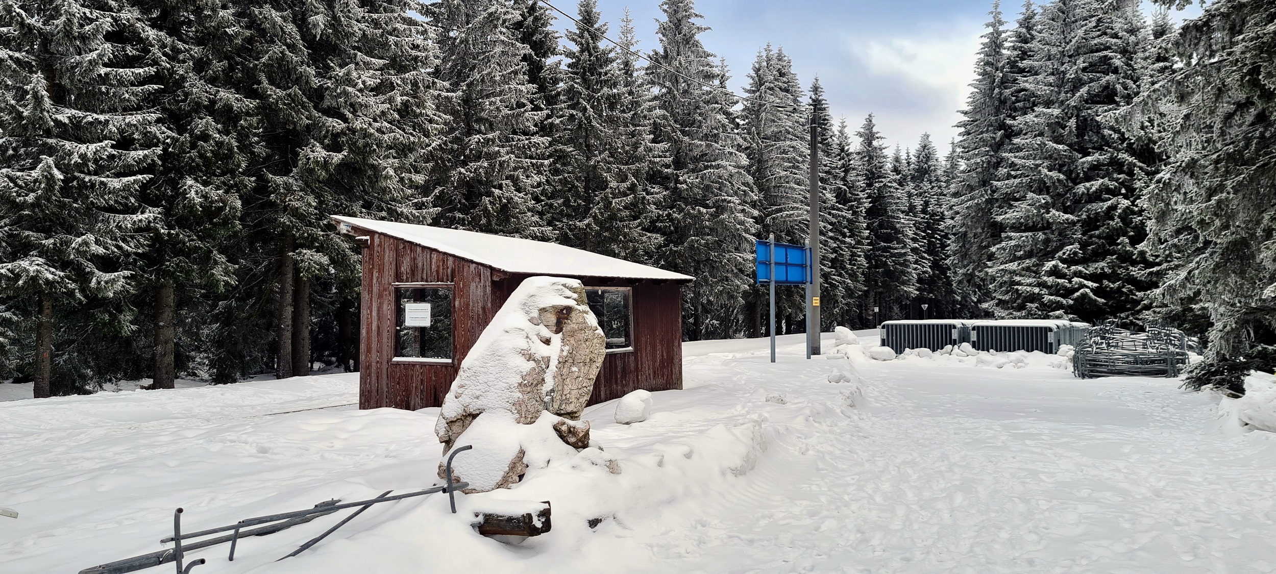 Dojście do peronu, nieczynnego już dzisiaj, o czym świadczą (przewrócone) barierki i informacje na planszach rozmieszczonych na oknach wiaty. Na pierwszym planie bryła kwarcu z pobliskiej kopalni "Stanisław", na której umieszczono (od strony torów) tablicę upamiętniającą 110-lecie najwyżej położonej linii kolejowej w Polsce. (Szklarska Poręba Jakuszyce, 2026-02-02) |