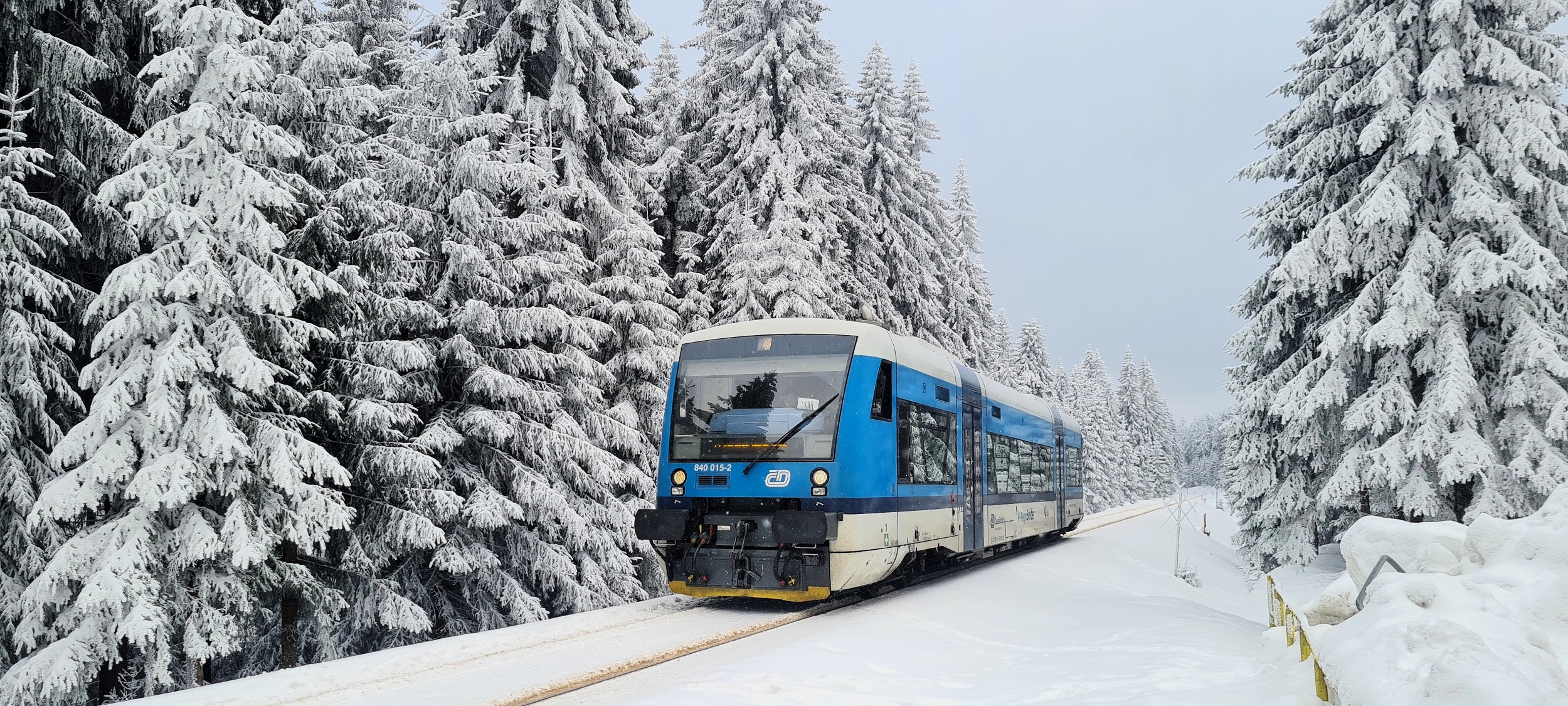 840 015-2 jako pociąg KD2662 z Liberca do Szklarskiej Poręby Górnej, kilkadziesiąt metrów przed peronem, od strony Harrachova. (Polana Jakuszycka, 2026-02-02) |