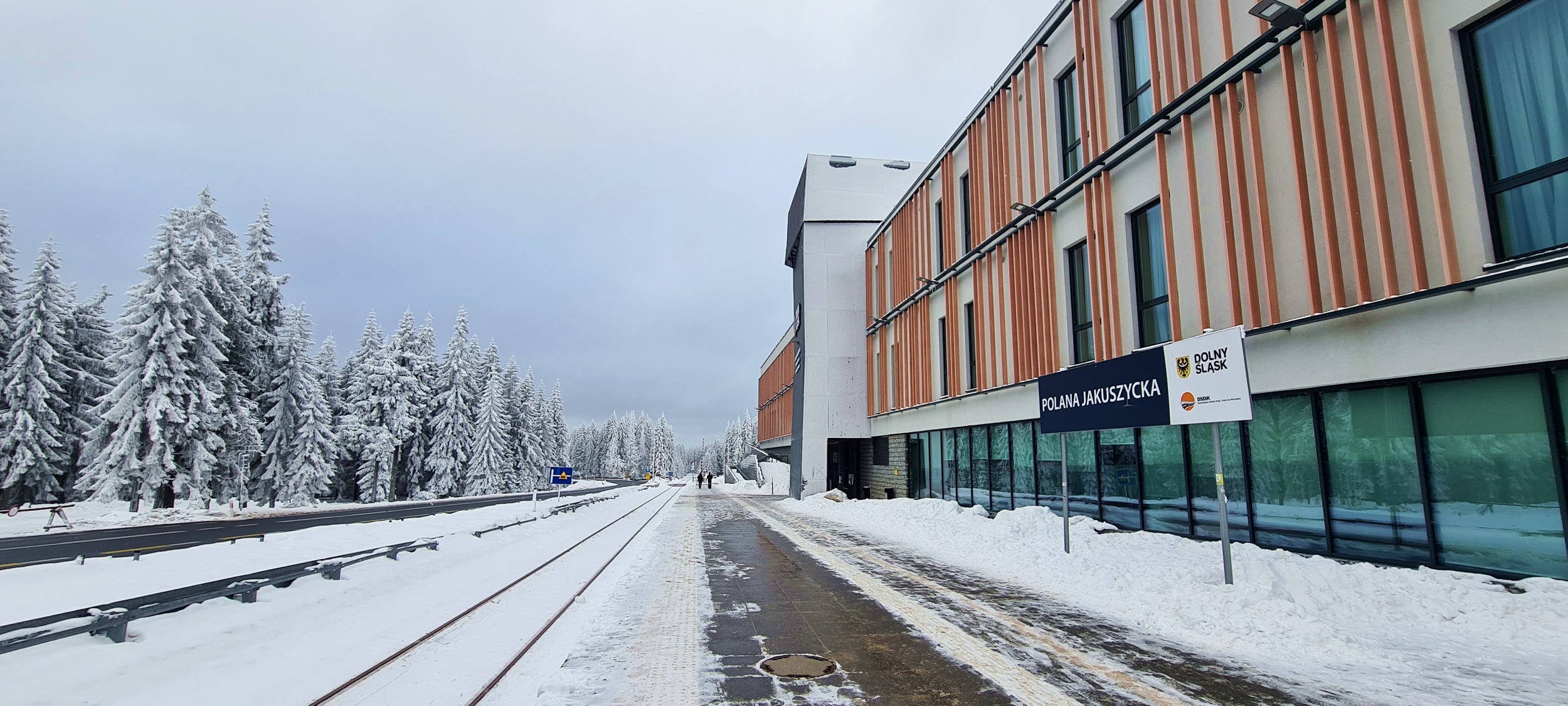 Peron przystanku kolejowego zintegrowany z kompleksem Dolnośląskiego Centrum Sportu. (Polana Jakuszycka, 2026-02-02) |