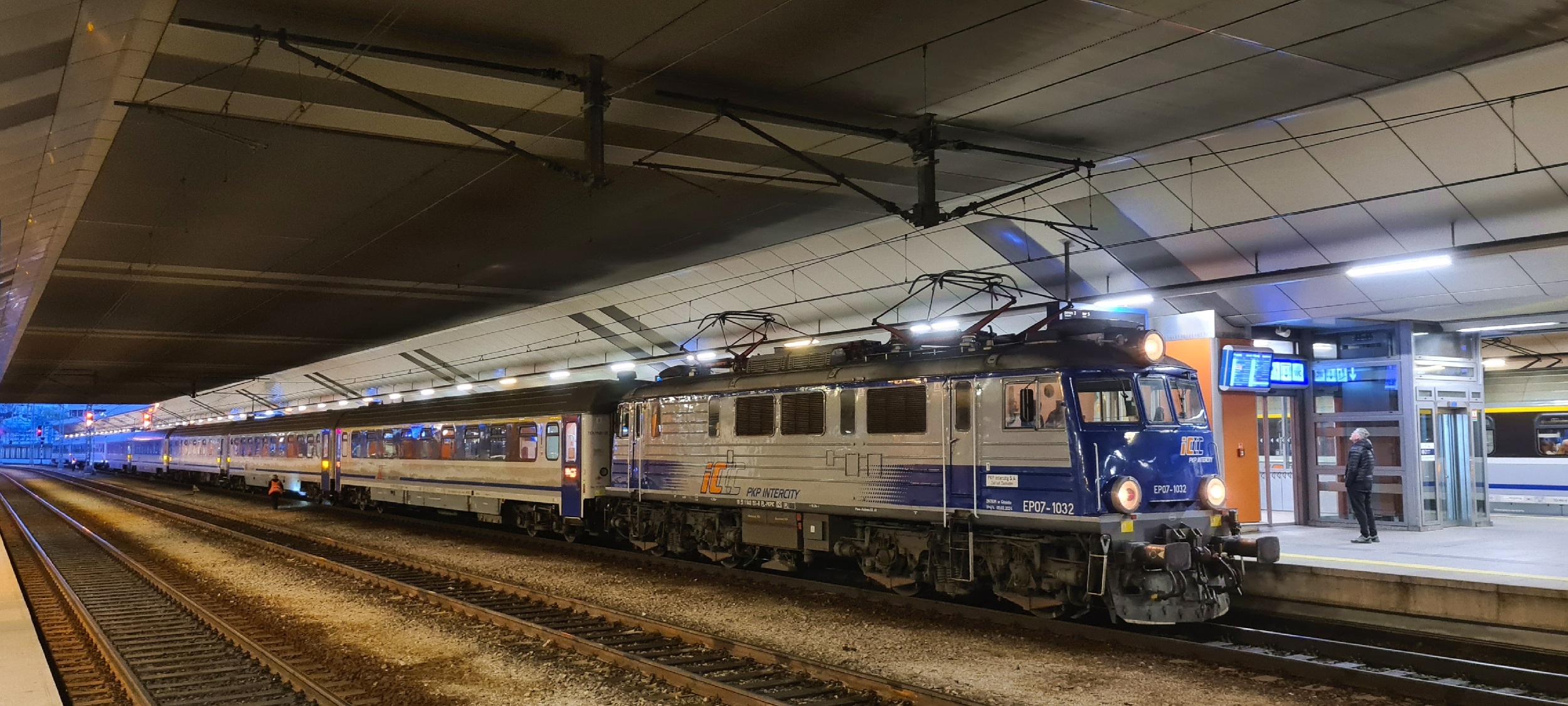 EP07-1032 na czele składu pociągu IC83172 „Podhalanin”, relacji Świnoujście - Zakopane. (Kraków Główny, 2026-04-09) |