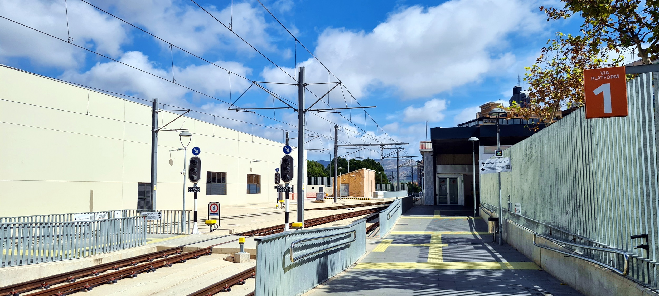 Widok z peronu 1 na wschodnią głowicę rozjazdową, wyjazd w stronę przystanku Benidorm Intermodal.
