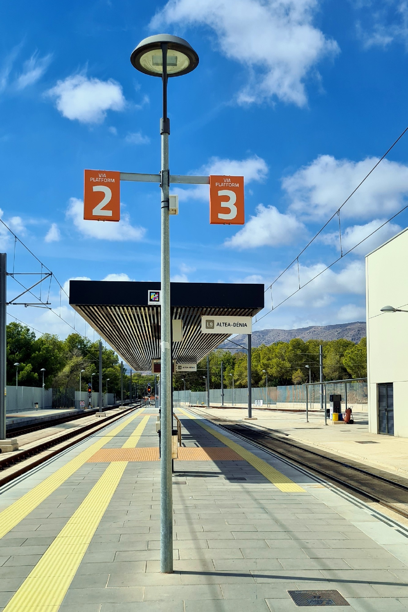 Linia kolei wąskotorowej (Trenet de la Marina ), łączącej Alicante z miasteczkiem Dénia, została przekuta na rozstaw 1435 mm, w części zelektryfikowana i w śródmieściu Alicante wprowadzona pod ziemię. (Benidorm, 2025-09-27) |