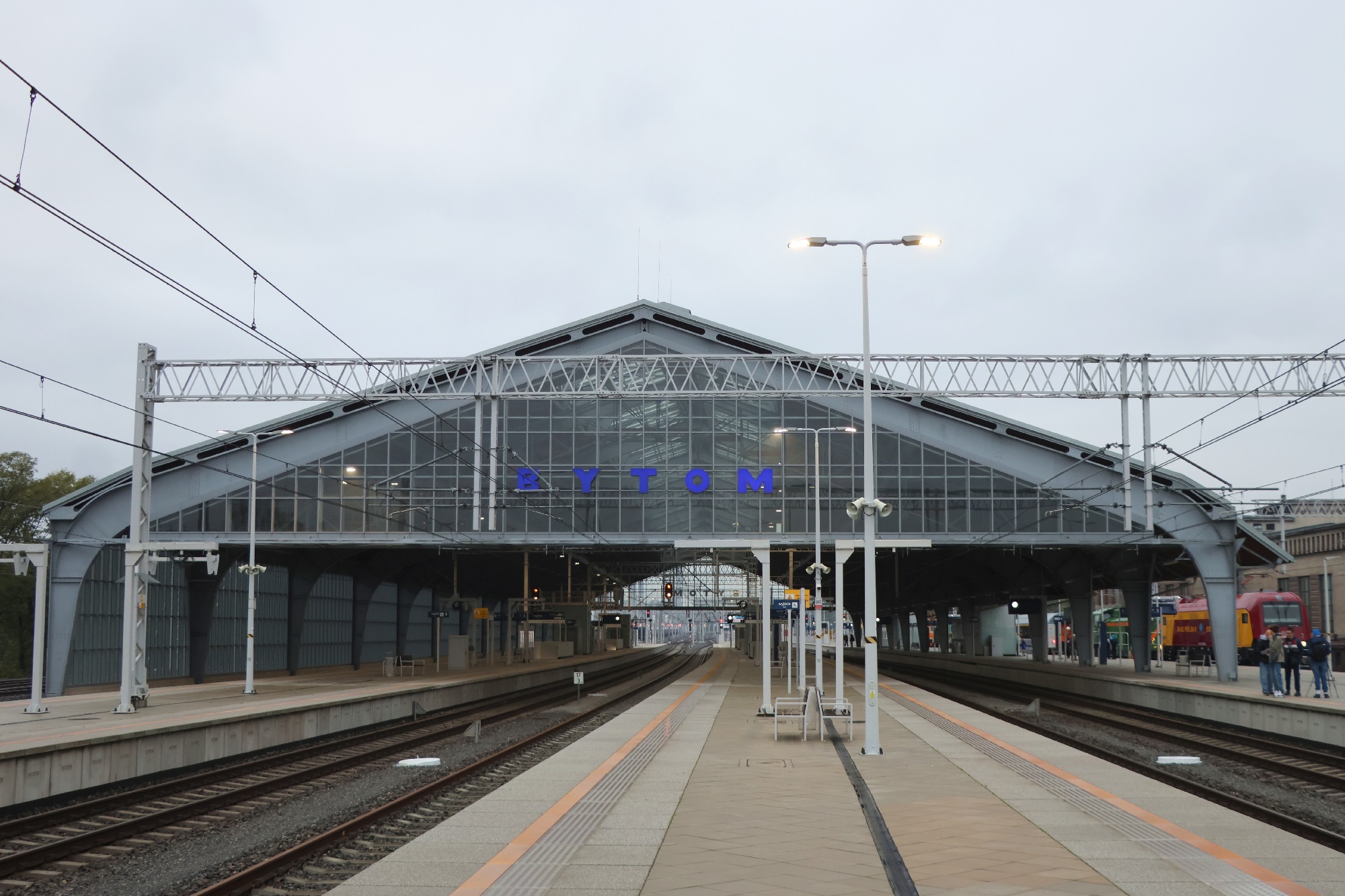 Widok z peronu 2 w stronę wschodnią, wschodnia ściana szczytowa hali peronowej. (Bytom, 2025-10-12) |