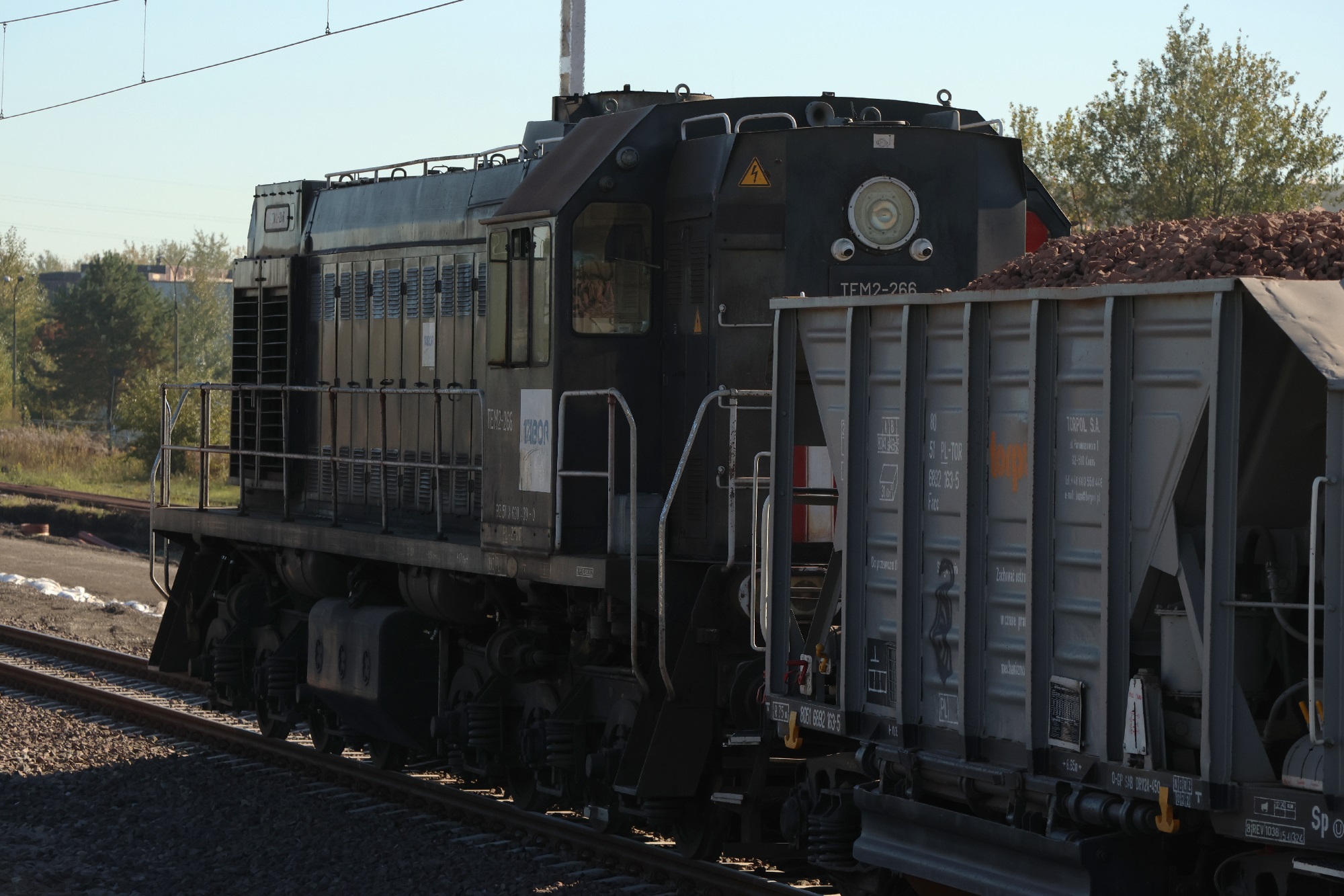 Po upadłości taborowej części TrachTechu, lokomotywa TEM2-266 trafiła do taboru Dębica. Na zdjęciu ze składem szutrówek, podczas pracy przy przebudowie Katowickiego Węzła Kolejowego. (Katowice Zawodzie, 2025-10-20) |