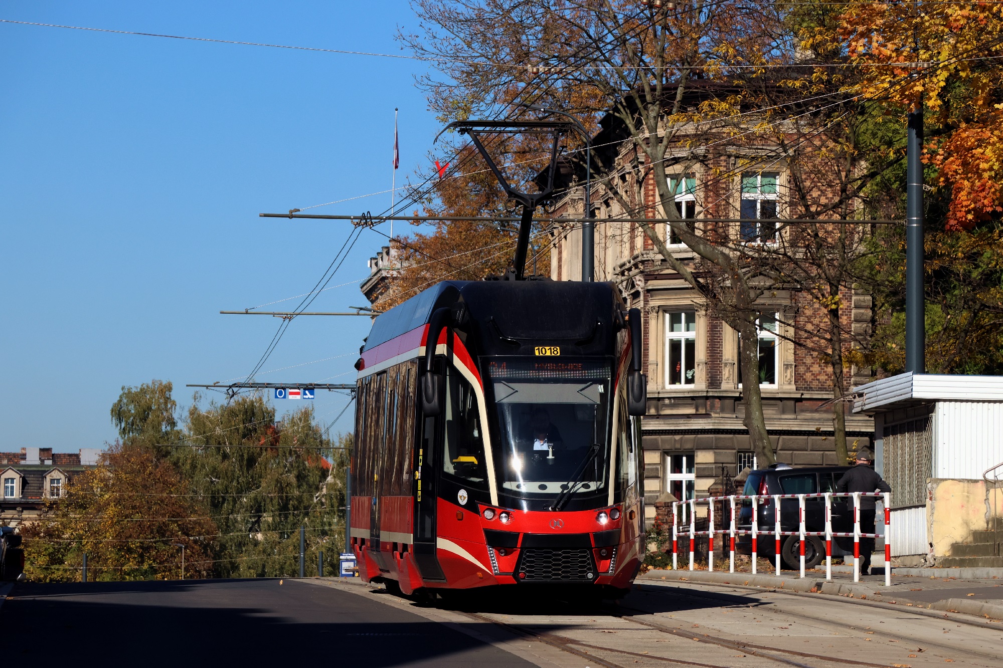 #1018 na linii 34 wspina się ulicą Powstańców w stronę dworca kolejowego. (Mysłowice, 2025-10-20) |
