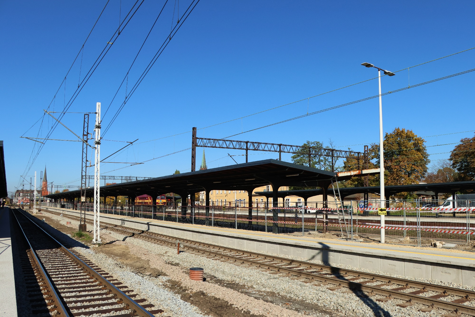 Nawierzchnia i wiata peronu 1 jest już gotowa. Na peronie 2 gotowe są krawędzie peronowe, trwa układanie nawierzchni pomiędzy nimi i prace przy poszyciu zadaszenia. Na peronie 3 pozostały już tylko prace brukarskie. .(Mysłowice, 2025-10-20) |