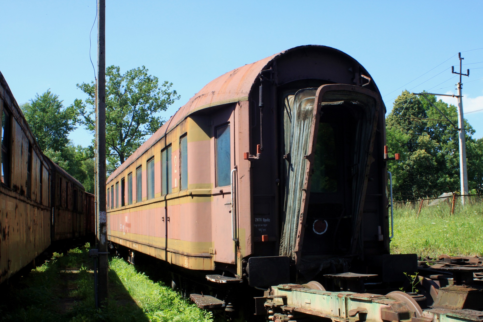 Wagon 2 klasy, oznqaczony 10-0019 XOa, czekający na zapleczu warsztatów na lepsze czasy. (Chabówka, 2013-07-09) |