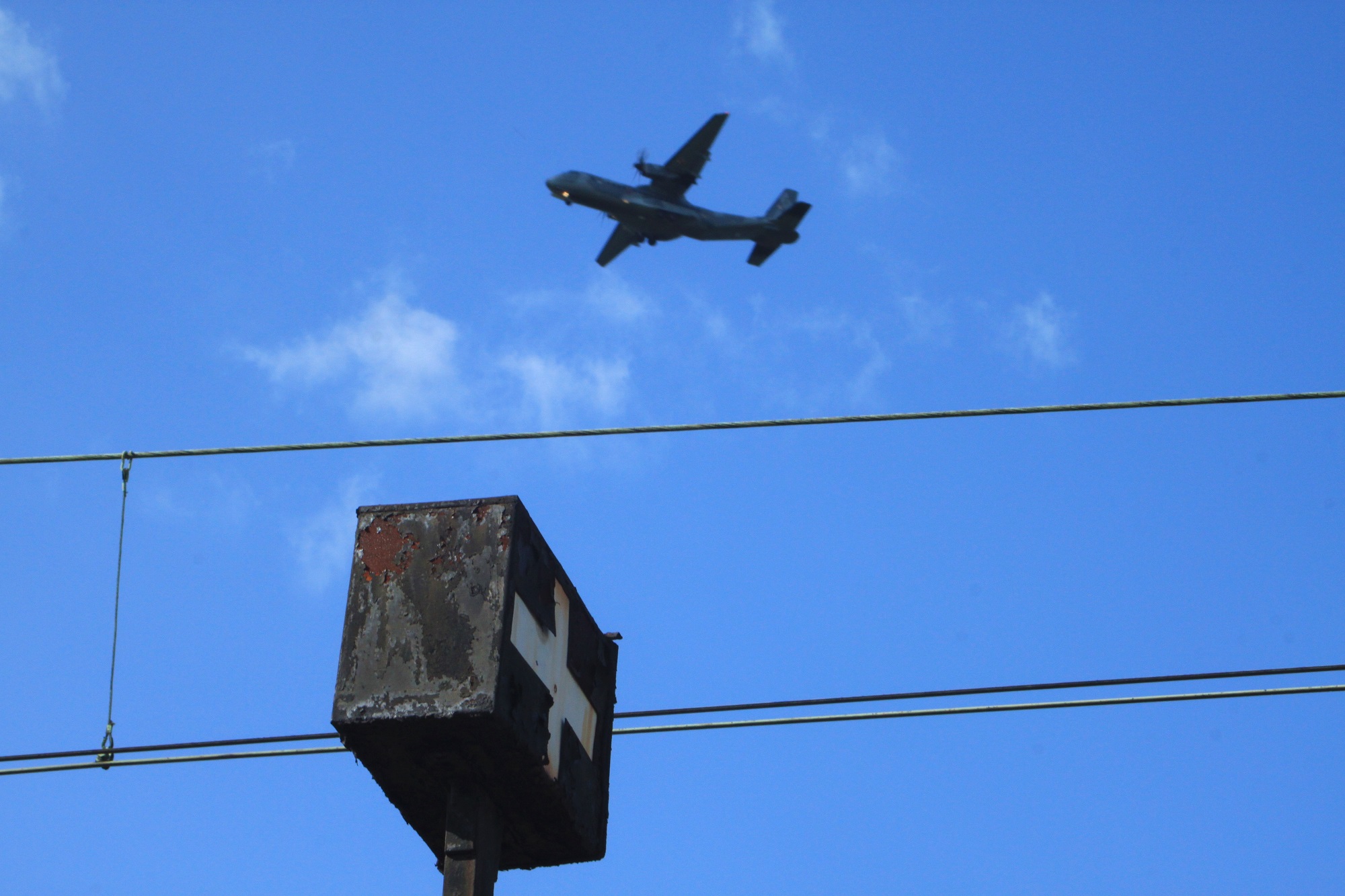 Niewiele na to wzkazuje, ale to ujęcie wykonane na stacji w Mydlnikach. W kadrze latarnia wskaźnika W4 na zachodnim krańcu peronu a w tle wojskowy samolot CASA C-295M, podchodzący do lądowania w Balicach. (Kraków Mydlniki, 2013-07-08) |