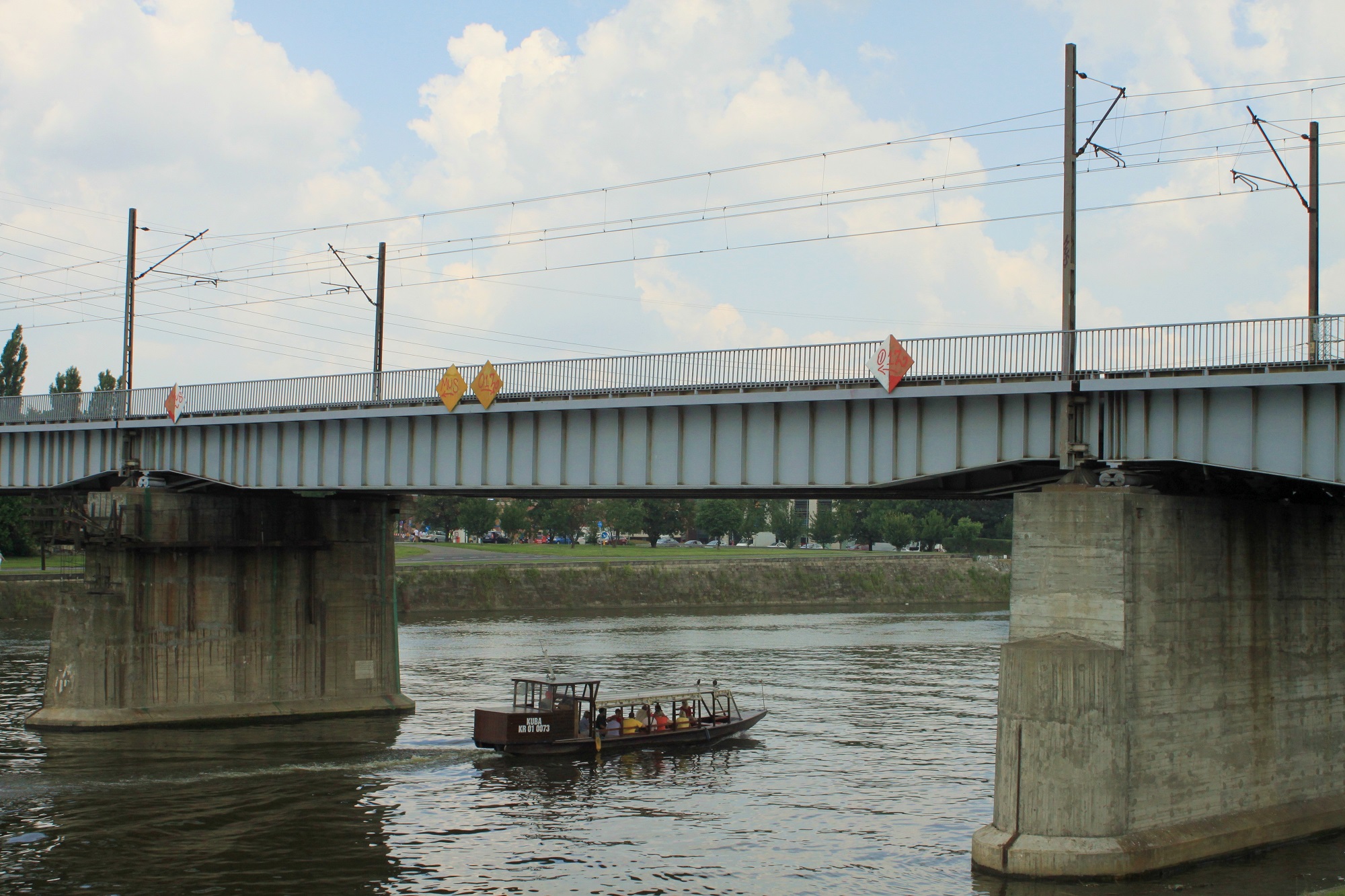 Most przez Wisłę, w sąsiedztwie przystanku Kraków Zabłocie, środkowa para przęseł nurtowych. Pod przęsłami KUBA KR01 0073, czyli pontono/barko/kajak obsługujący Krakowski Tramwaj Wodny. (Kraków Zabłocie, 2013-07-05) |
