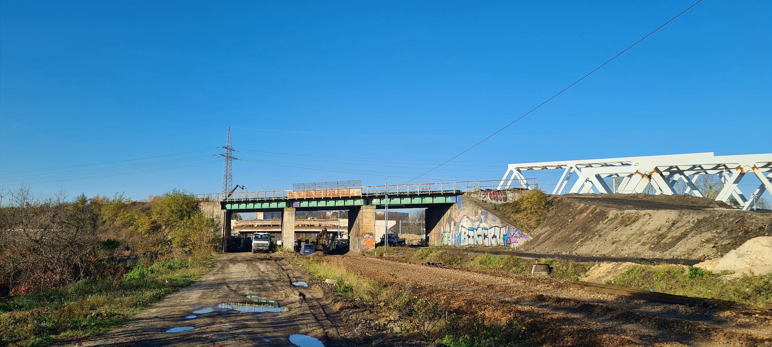 Stary wiadukt w stronę Ligoty, obecnie spełniający rolę dojazdu sprzętu budowlanego z zaplecza przy parowozowni na południową stronę. (Katowice, 2025-11-06) |