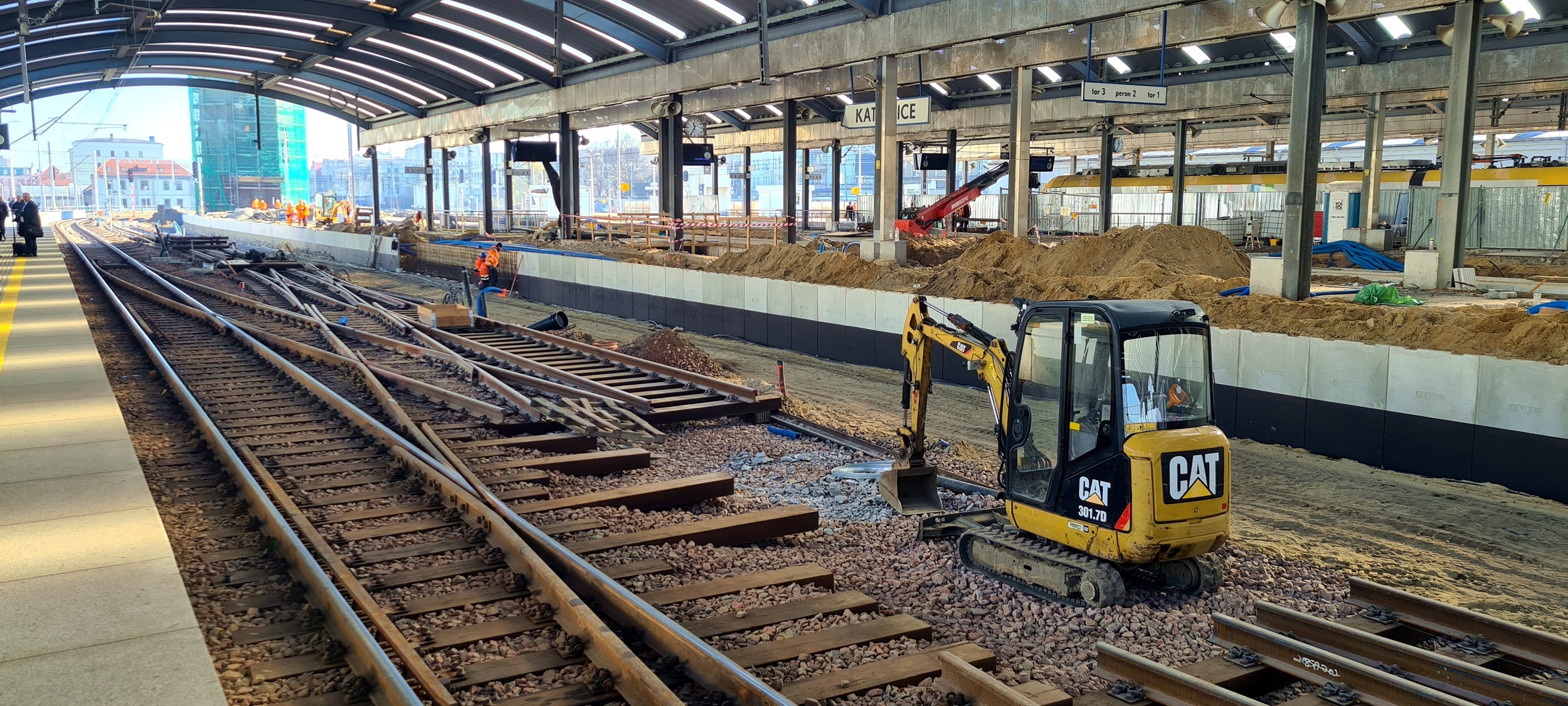 Niespiesznie budowany zespół czterech rozjazdów i skrzyżowania, mających połączyć tory 5 i 7. W zamyśle układ pozwoli na jednoczesne i bezkolizyjne przyjmowanie/odprawianie dwóch składów z jednej krawędzi peronowej. (Katowice, 2025-11-06) |