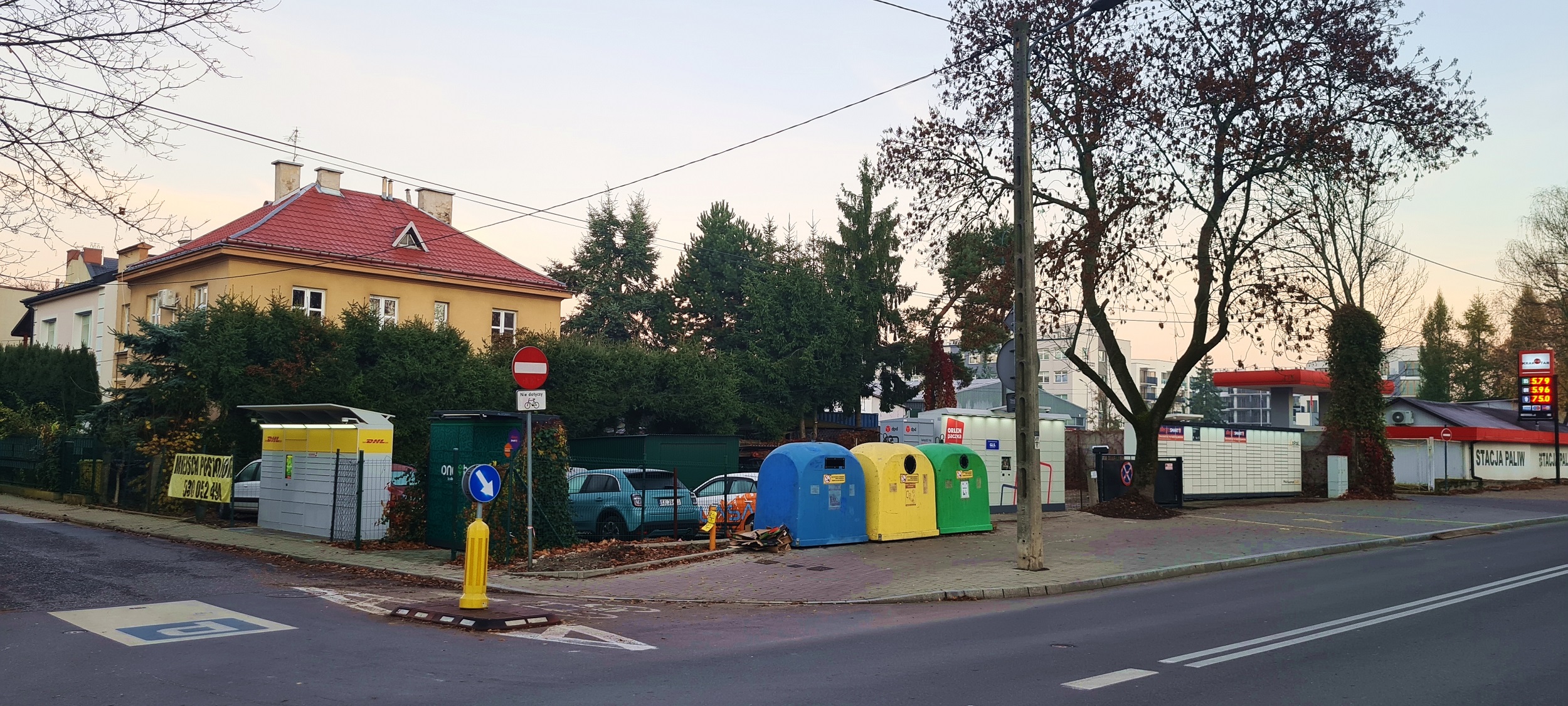 Zaczynając zwiedzanie od lewej strony zaobserwować możemy wyrazistą w formie i treści Szmatę Reklamową. Potem zestaw pięciu różnych (!) automatów paczkowych (*nazwa niezastrzeżona). Ciąg szaf rozdzielono śmietnikiem na prawie specjalnym (żeby się ekoterroryści nie czepiali) i zakończono przepięknej urody BZBWI. Pierzeja kończy kadr filigranowym budyneczkiem stacji benzynowej, wykończonym Sidingiem.