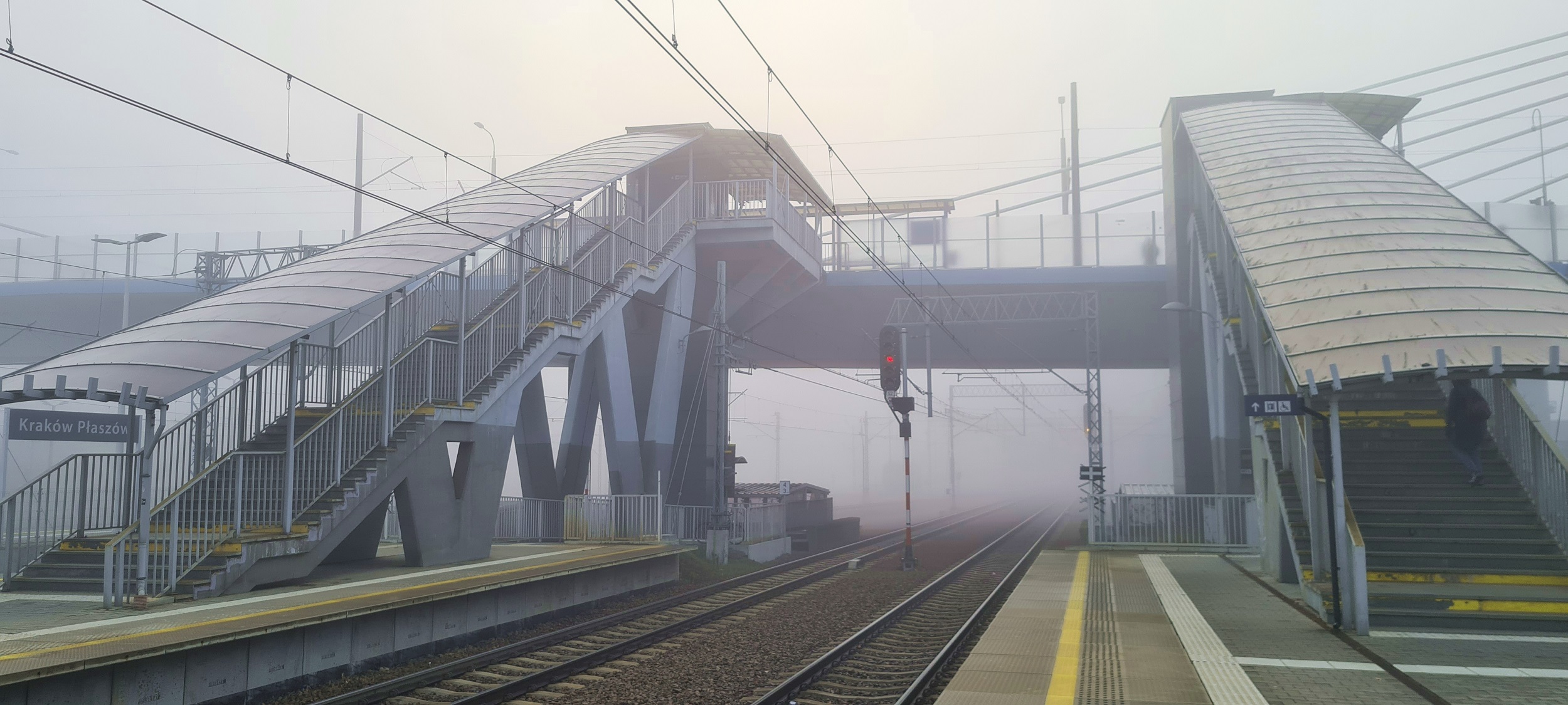 Komentarz: Poranna mgła i zejścia z estakady na peron 3 i 2. (Kraków Płaszów, 2025-11-05)