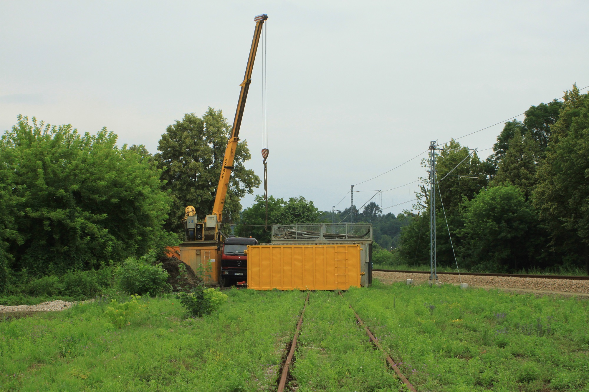 Komentarz: Ostatnie miejsce w obrębie stacji, w którym trwają jeszcze prace budowlane. W sąsiedztwie domku toromistrza rozłożyło się zaplecze budowy miejskiej sieci kanalizacyjnej. (Wieliczka Park, 2013-06-27)