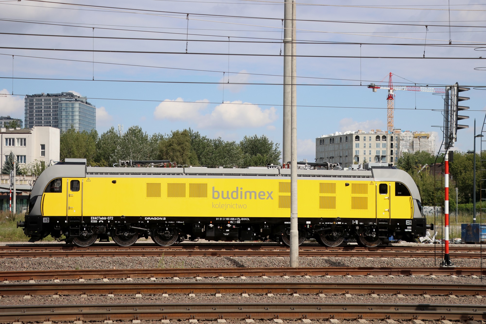 E6ACTadnb-072 należący do głównego wykonawcy trwającej przebudowy stacji, czekający na zatrudnienie na skrajnie północnym torze. (Warszawa Zachodnia, 2025-08-02) |