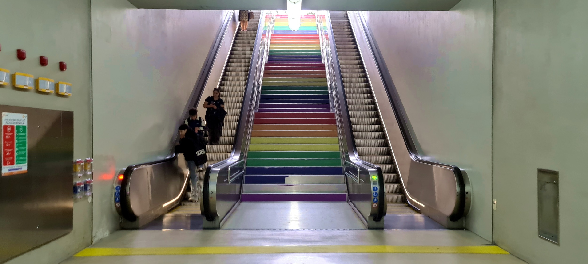 Schody wychodzące na Av. General Marvá, łączące pośredni poziom stacji TRAM Metropolitano de Alicante, na którym znajdują się kasy, przechowalnia bagażu i podziemny P+R, z Placa de los Luceros. (Alicante, 2025-10-06) |