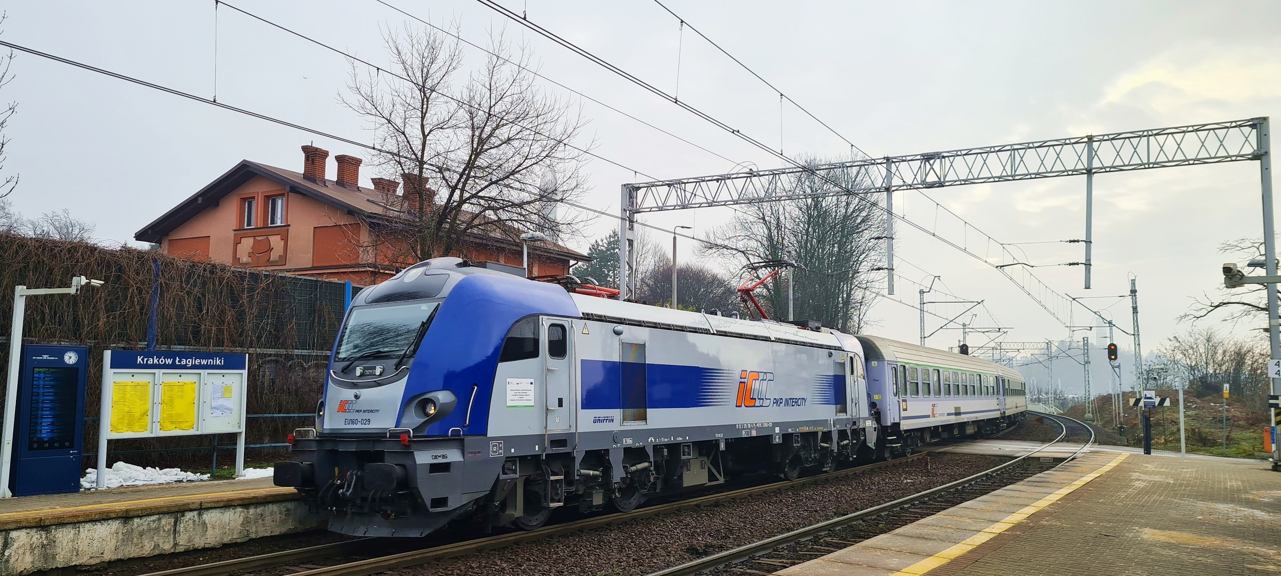 EU160-029 na czele pociągu TLK38108 „Lubomirski”, relacji Zakopane - Kołobrzeg. (Kraków Łagiewniki, 2025-12-04) |