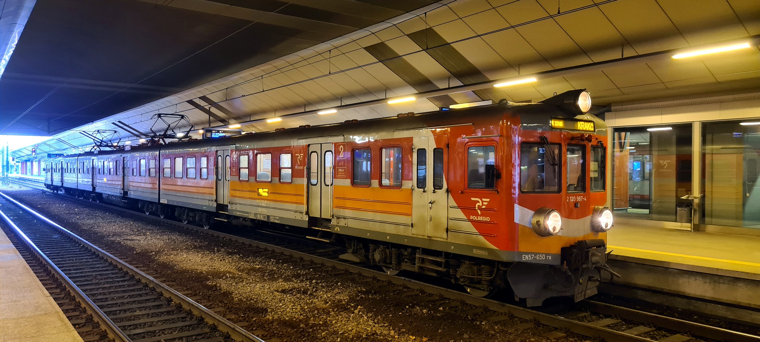 EN57-650 jako pociąg R33145 K33 „Jurajski” z Wolbromiea. Oświetlenie czoła sugeruje, że skład jest już obrócony i przechodzi na inny pociąg, choć wyświetlacze jeszcze pokazują poprzednią relację. (Kraków Główny, 2025-12-08) |
