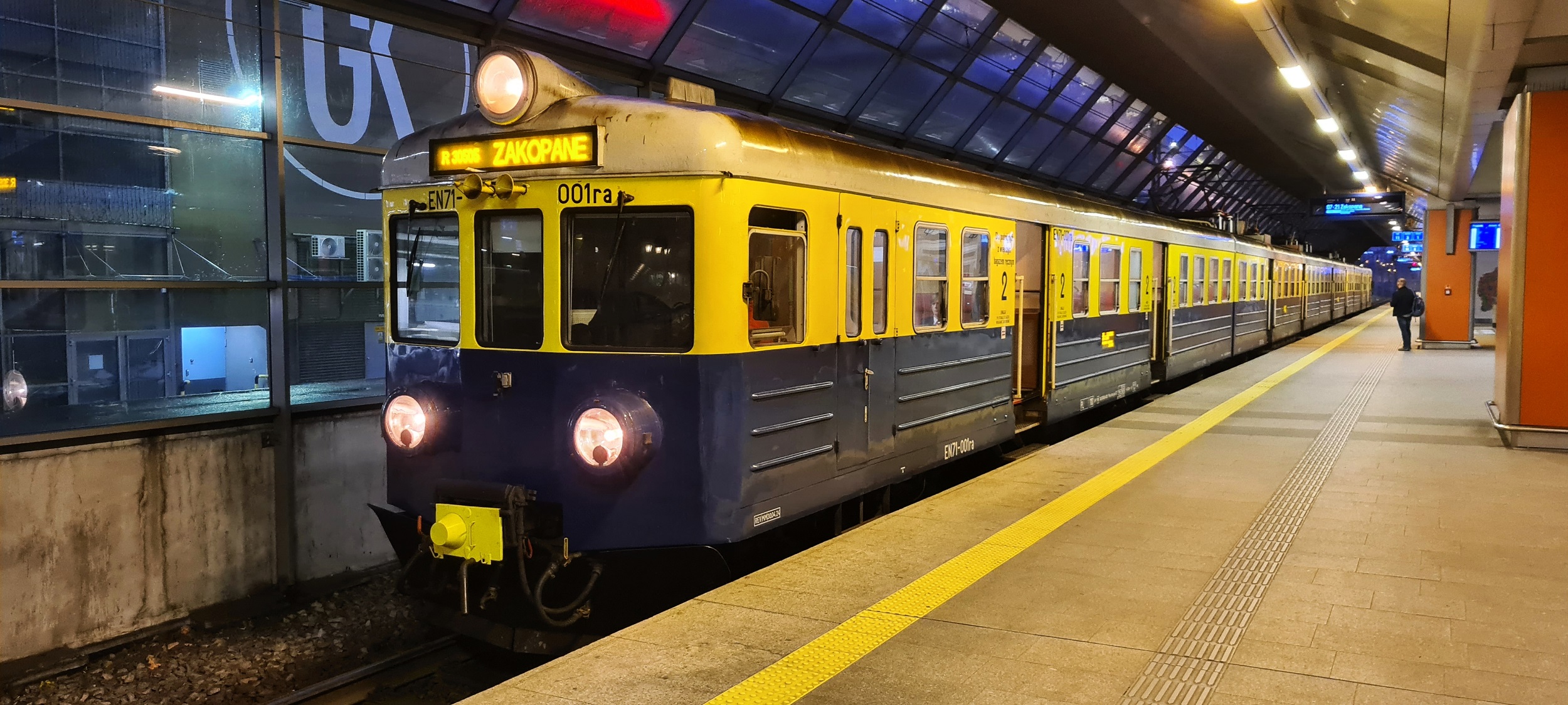 EN71-001 jako pociąg regio R30505 „Kasprowy”, do Zakopanego. (Kraków Główny, 2025-12-11) |