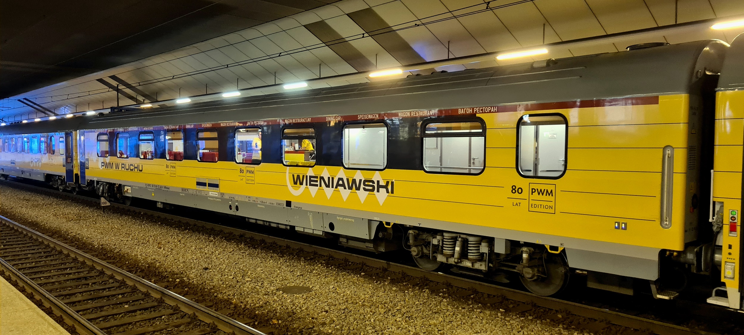 Wagon gastronomiczny 50 51 88-70 240-9 WRmnouz, w okleinie „PWM w Ruchu, Pociąg Wypełniony Muzyką”, w składzie pociągu specjalnego, uruchomionego z okazji 80 rocznicy powstania Polskiego Wydawnictwa Muzycznego. Przejazd odbędzie się na trasie Kraków Główny – Gdynia Główna, przez między innymi Częstochowę, Zduńską Wolę Karsznice, Łódź Widzew, Warszawę Centralną, Iławę Główną i Gdańsk Główny. (Kraków Główny, 2025-12-21) |