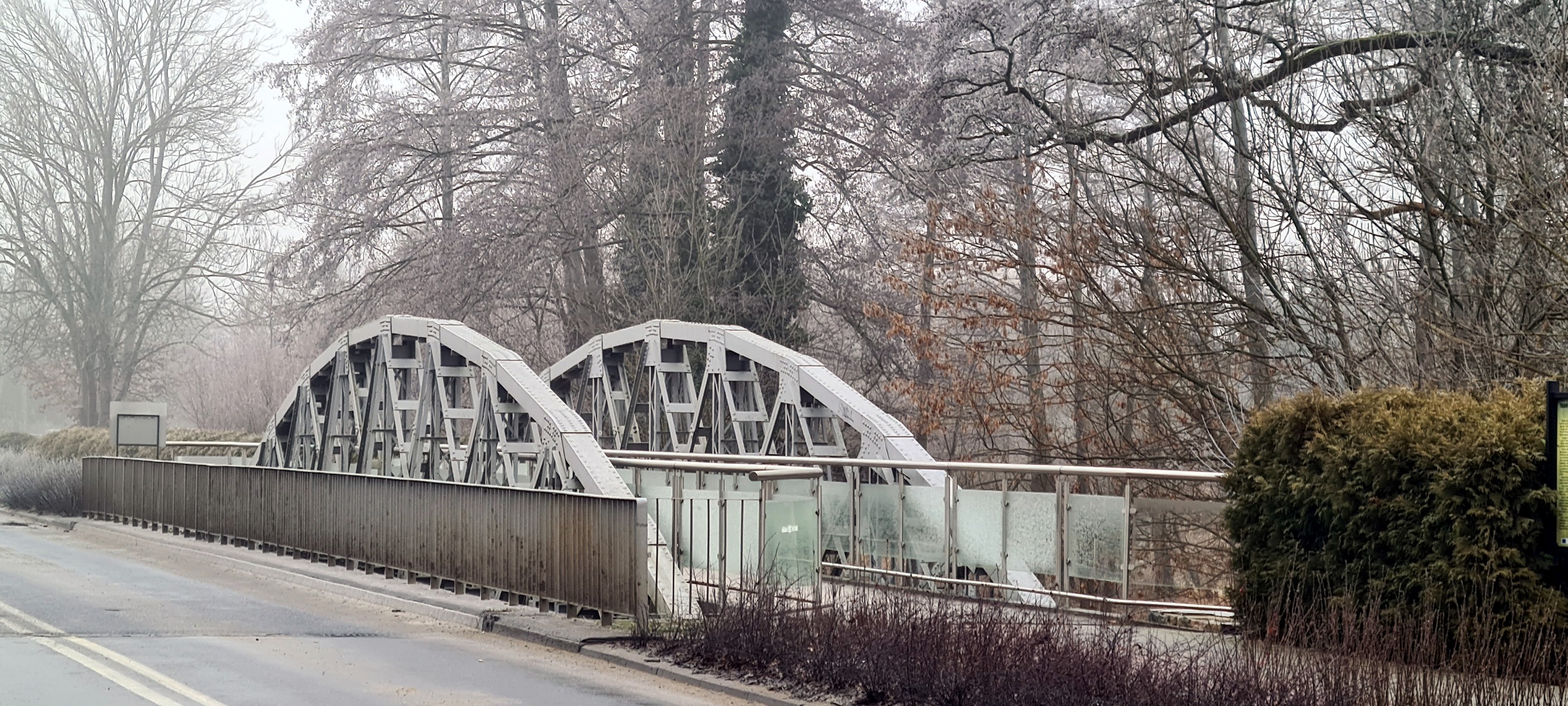 Stalowy, nitowany most tramwajowy przez Ner, oddany do użytku w 1916roku. Do 1993 roku poruszały się po nim tramwaje linii 42. Obecnie jest częścią ciągu pieszego. (Rzgów, 2025-12-28) |