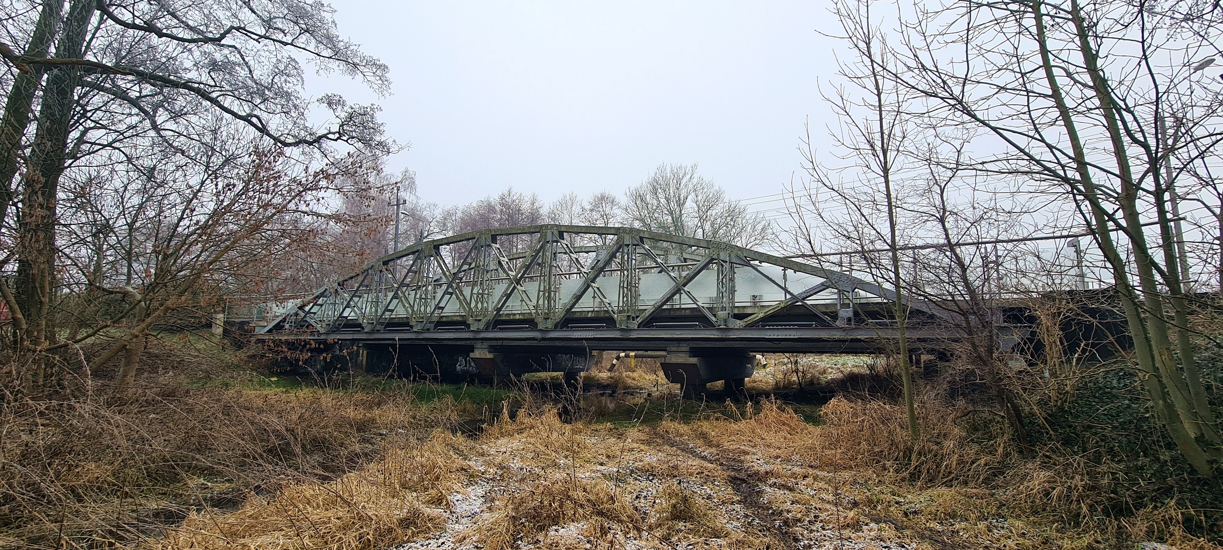 Stalowy, nitowany most tramwajowy przez Ner, oddany do użytku w 1916roku. Do 1993 roku poruszały się po nim tramwaje linii 42. Obecnie jest częścią ciągu pieszego. (Rzgów, 2025-12-28) |