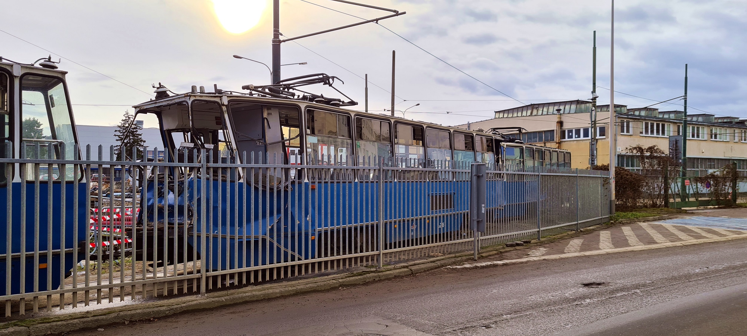 Wypadek miał miejsce trzeciego grudnia 2025 roku, na ulicy Bieńczyckiej. Trójskład, jadący jako tramwaj linii 52, ucierpiał w wyniku najechania przez wóz N8C-NF #HK454, obsługujący linię 5. W konsekwencji zderzenia połamane zostały sprzęgi pomiędzy wagonami Ufoka i doszło do rozbicia wszystkich wozów. Rannych zostało około 30 osób, w tym motorowy z „piątki” - ciężko. Doznał on złamania obu nóg. (Kraków, Zajezdnia Podgórze, 2026-01-02) |