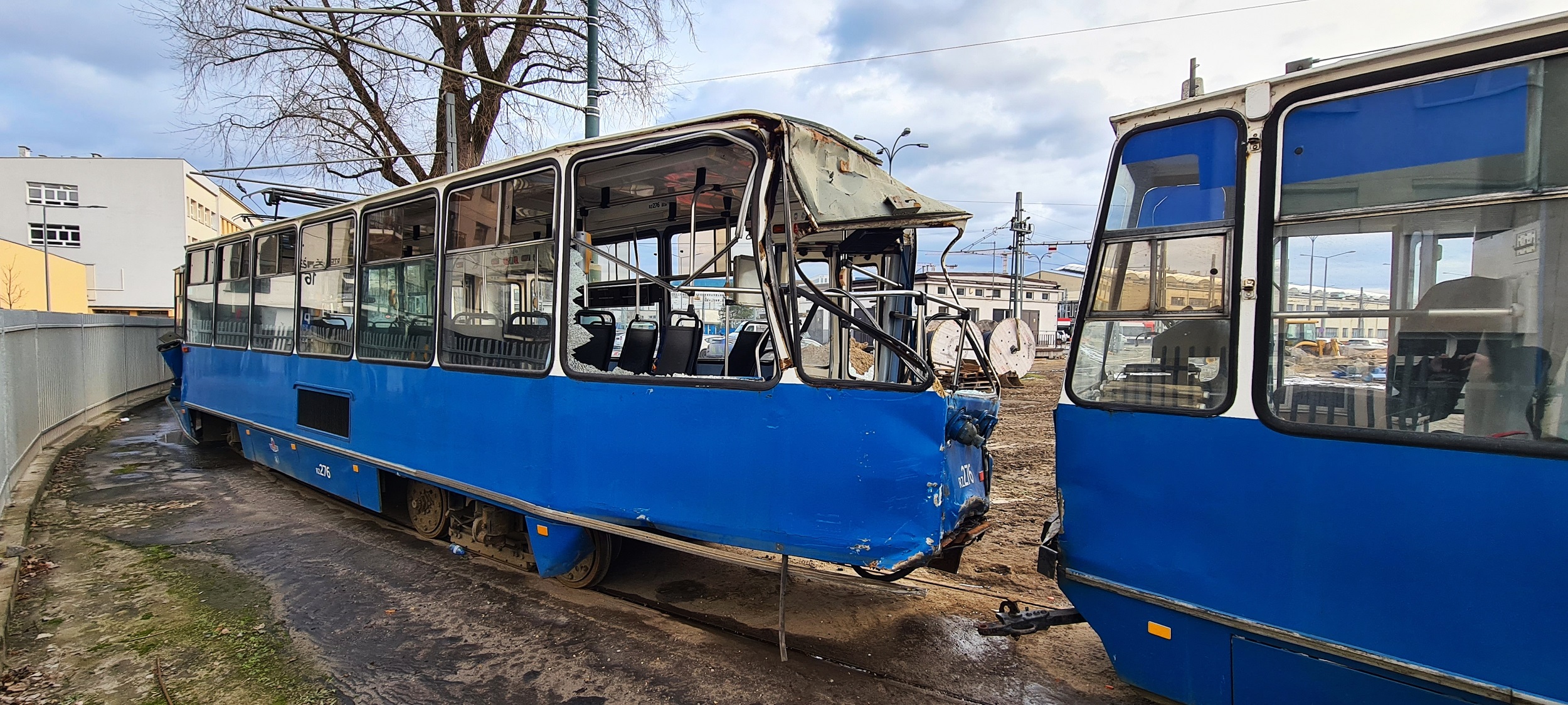 Wypadek miał miejsce trzeciego grudnia 2025 roku, na ulicy Bieńczyckiej. Trójskład, jadący jako tramwaj linii 52, ucierpiał w wyniku najechania przez wóz N8C-NF #HK454, obsługujący linię 5. W konsekwencji zderzenia połamane zostały sprzęgi pomiędzy wagonami Ufoka i doszło do rozbicia wszystkich wozów. Rannych zostało około 30 osób, w tym motorowy z „piątki” - ciężko. Doznał on złamania obu nóg. (Kraków, Zajezdnia Podgórze, 2026-01-02) |