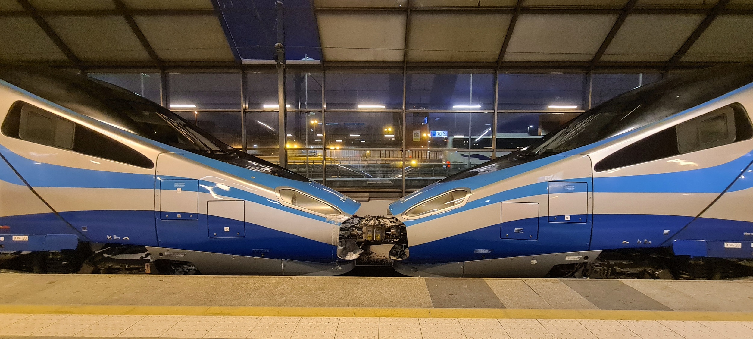 ED250-018 i ED250-013 jako pociąg EIP3510 do Gdyni Głównej, gotów do odjazdu z toru 12 przy peronie 5. (Kraków Główny, 2026-01-09) |