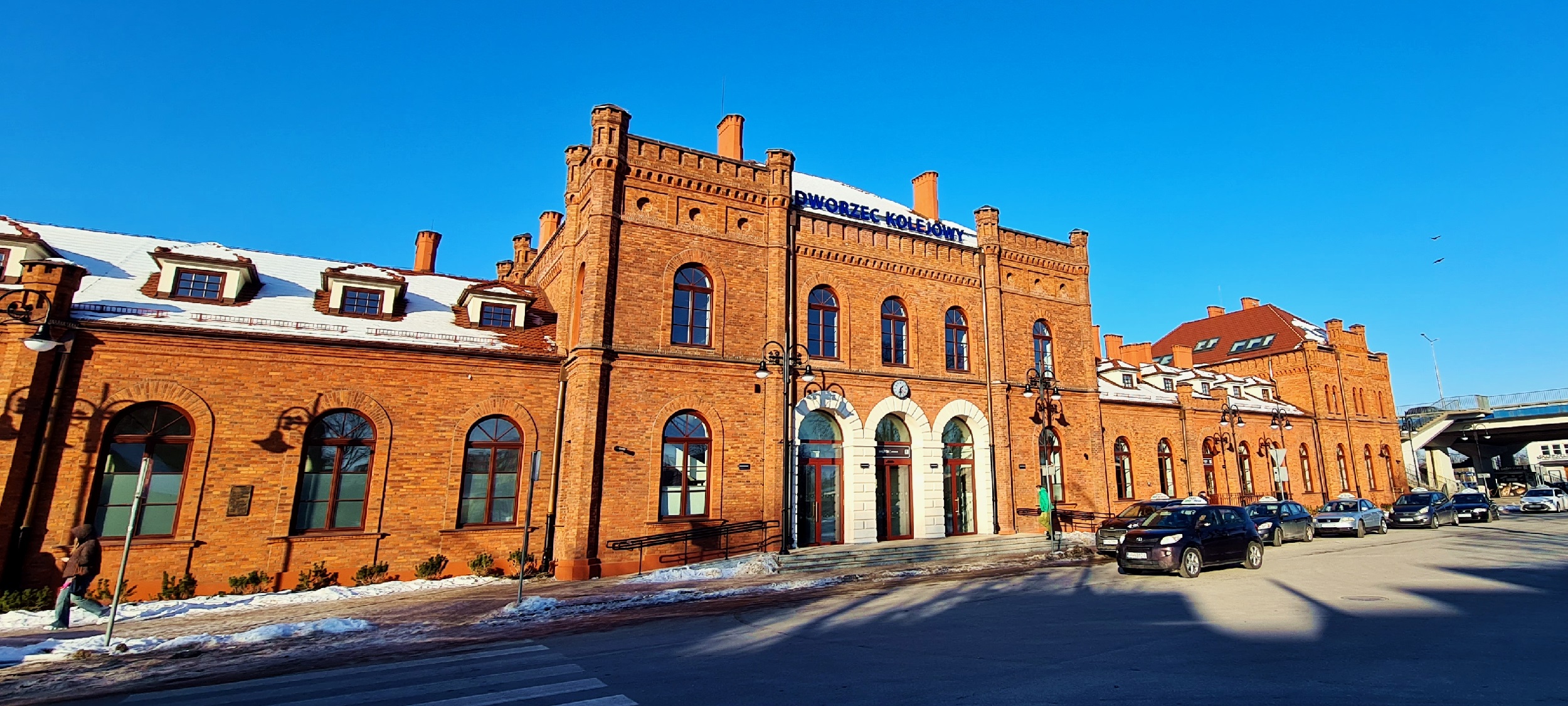 Widok od strony ulicy dworcowej na budynek dworca. Ucięte zachodnie skrzydło, w kadr nie weszło. ;) (Skierniewice, 2026-01-18) |