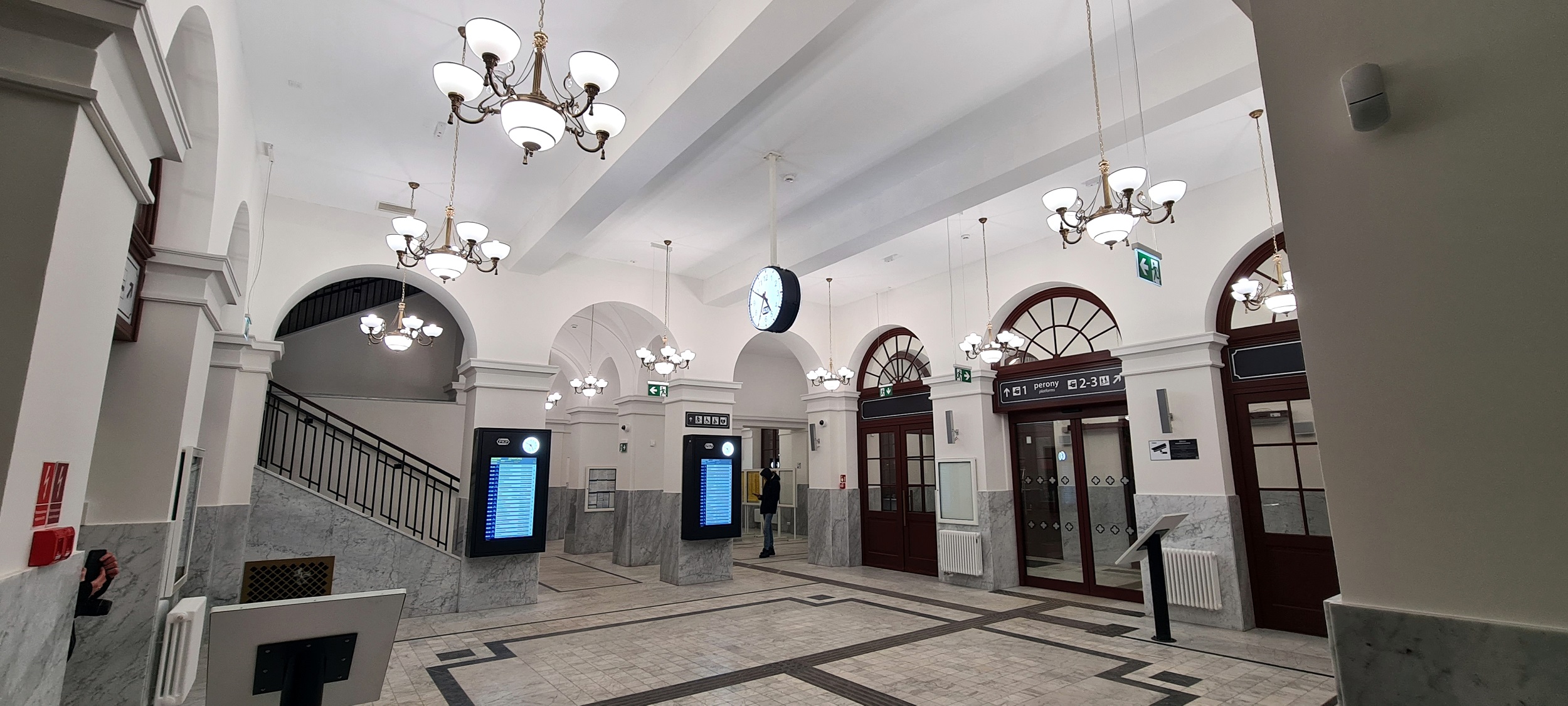 Hol główny, w centralnej części budynku dworca Po prawej wyjścia na peron 1. W głębi, pomiędzy tablicami SIP, przejście do poczekalni i kas w zachodnim skrzydle . (Skierniewice, 2026-01-18) |