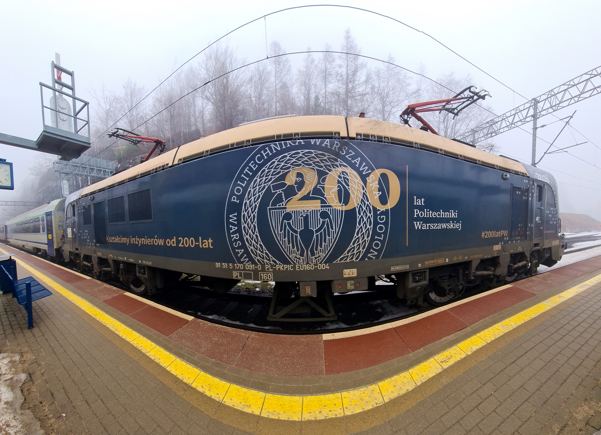 EU160-004 w okolicznościowej okleinie „200 Lat Politechniki Warszawskiej”, na czele składu pociągu IC6138 „Orzeszkowa”, do Warszawy Wschodniej. (Szklarska Poręba Górna, 2026-02-08) |