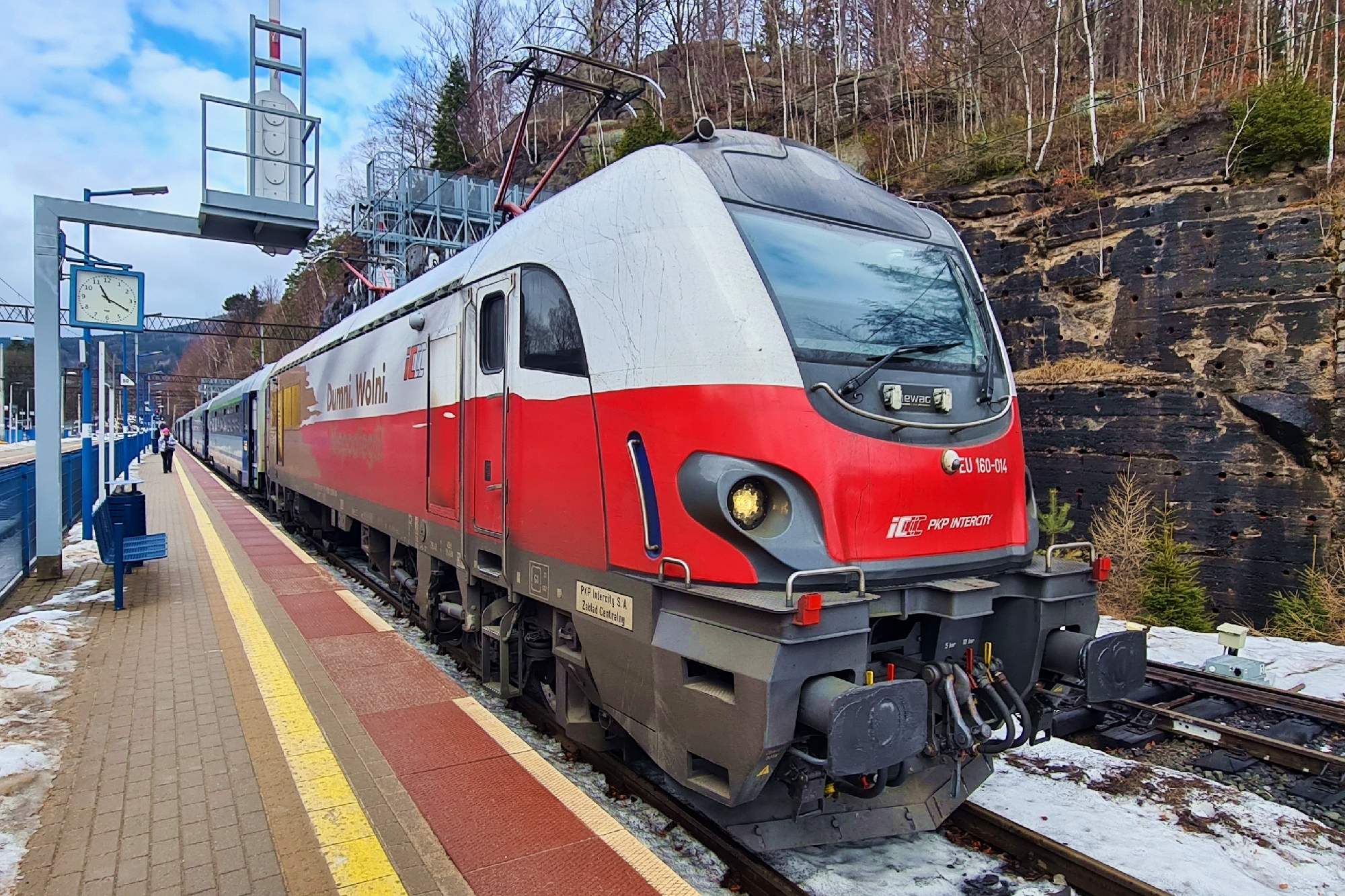EU160-014 w okolicznościowej okleinie „Dumni, Wolni, Niepodlegli!”, na czele składu pociągu IC6138 „Orzeszkowa”, do Warszawy Wschodniej. (Szklarska Poręba Górna, 2026-02-06) |