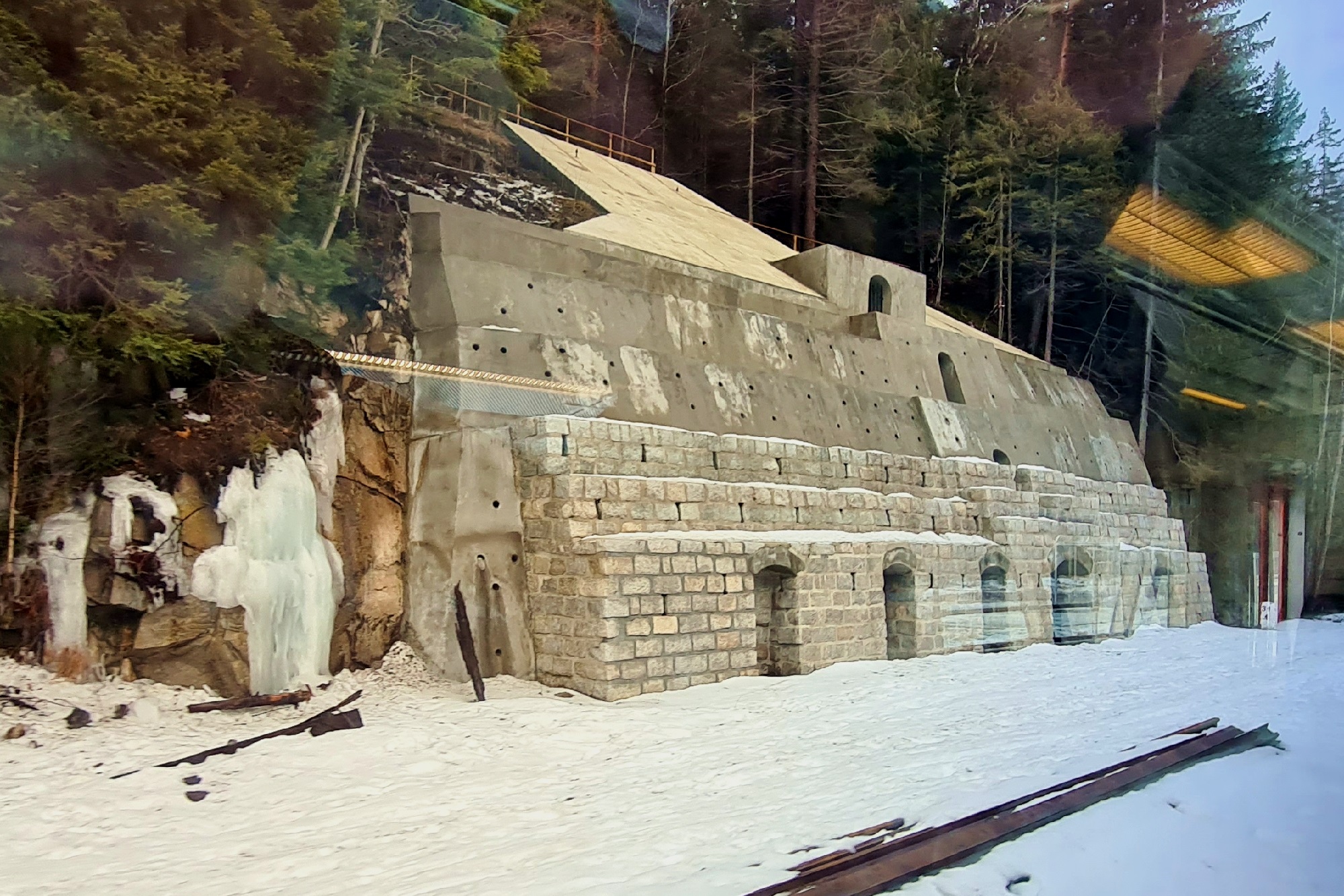 Umocnienie skarpy ponad równią stacyjną. Wewnątrz pomieszczenia techniczne, prawdopodobnie mieszczące niegdyś wyciągarkę do prowadzenia manewrów bez zastosowania lokomotywy. (Szklarska Poręba Huta, 2026-02-07) |