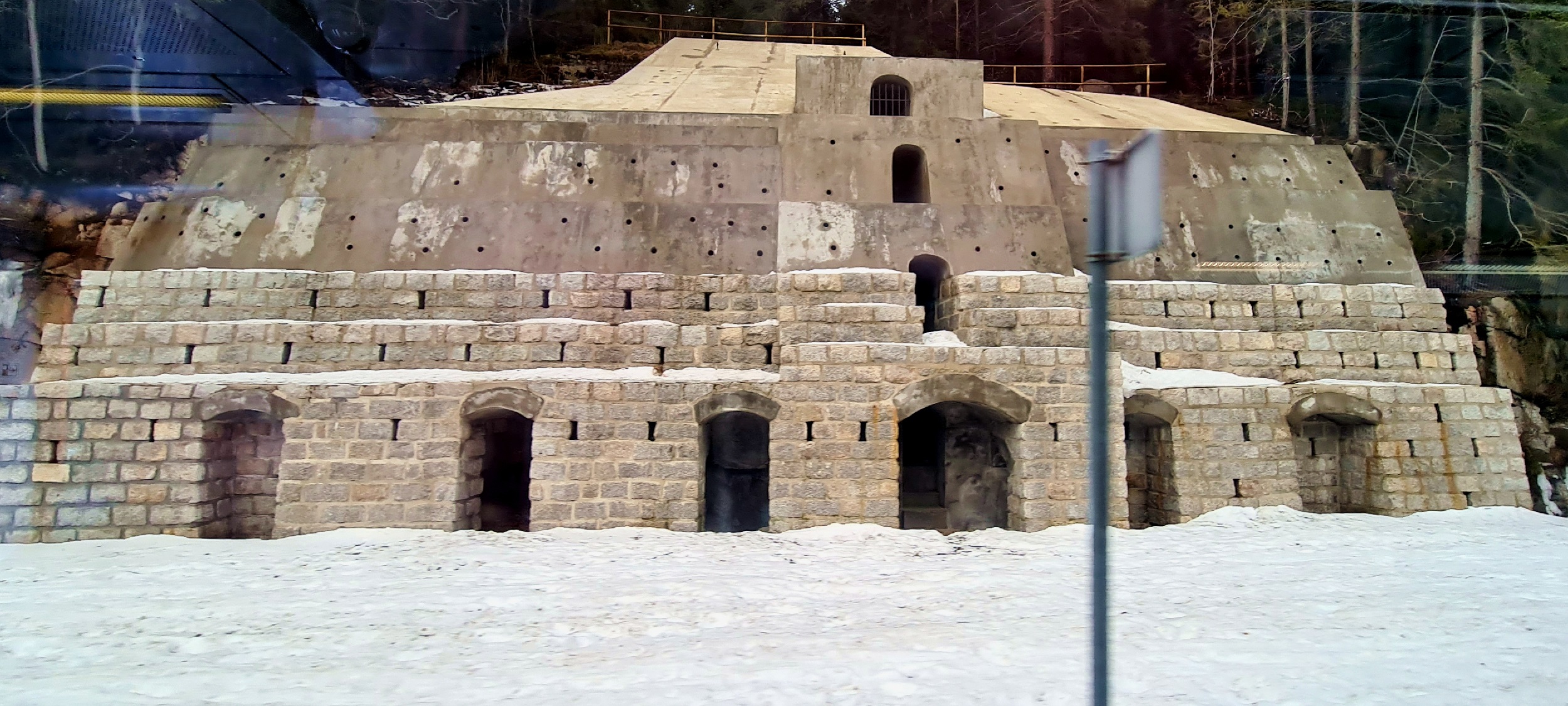 Umocnienie skarpy ponad równią stacyjną. Wewnątrz pomieszczenia techniczne, prawdopodobnie mieszczące niegdyś wyciągarkę do prowadzenia manewrów bez zastosowania lokomotywy. (Szklarska Poręba Huta, 2026-02-07) |