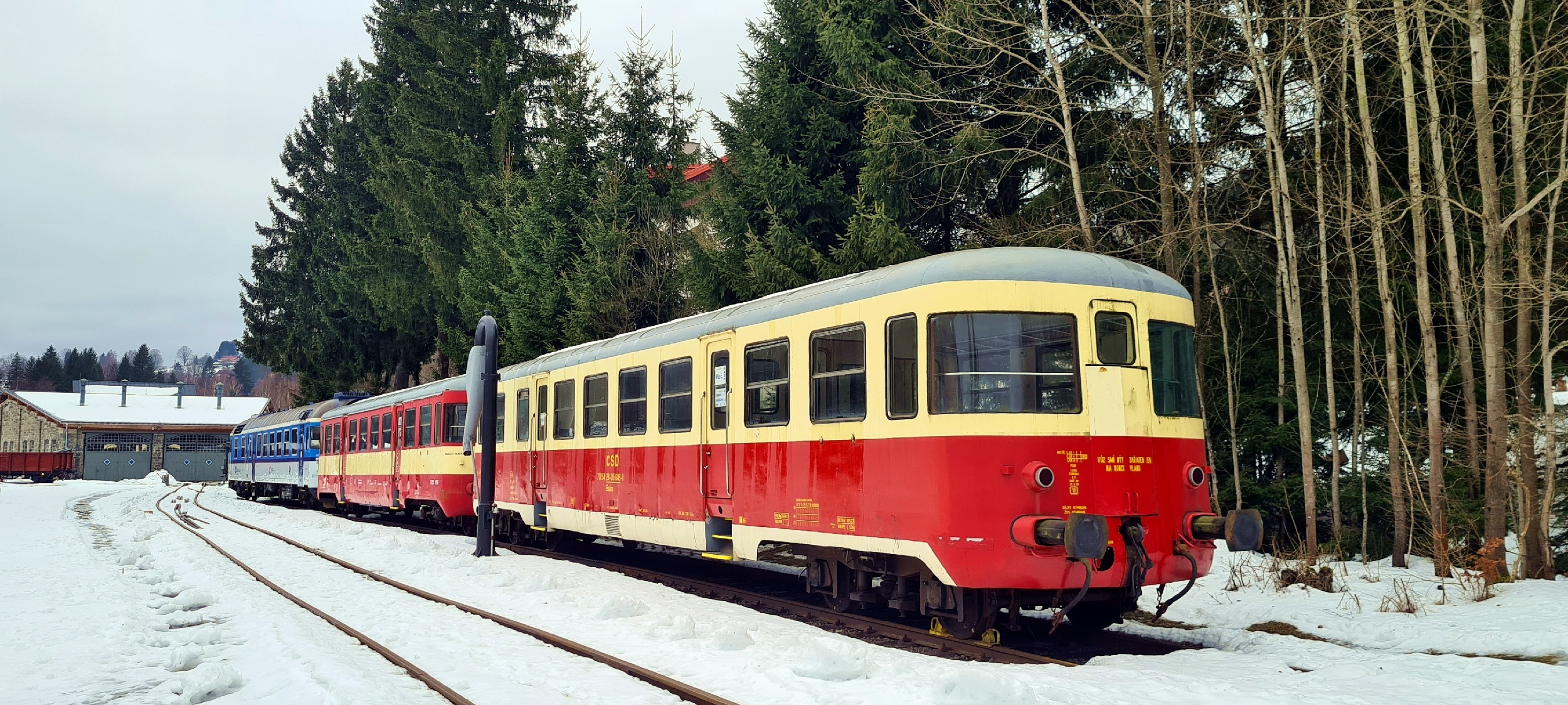 Doczepka serii 020 w składzie z motorakiem 854 225-0 i drugą doczepą , zimująca na skrajnie północnym torze stacji. (Kořenov, 2026-02-05) |