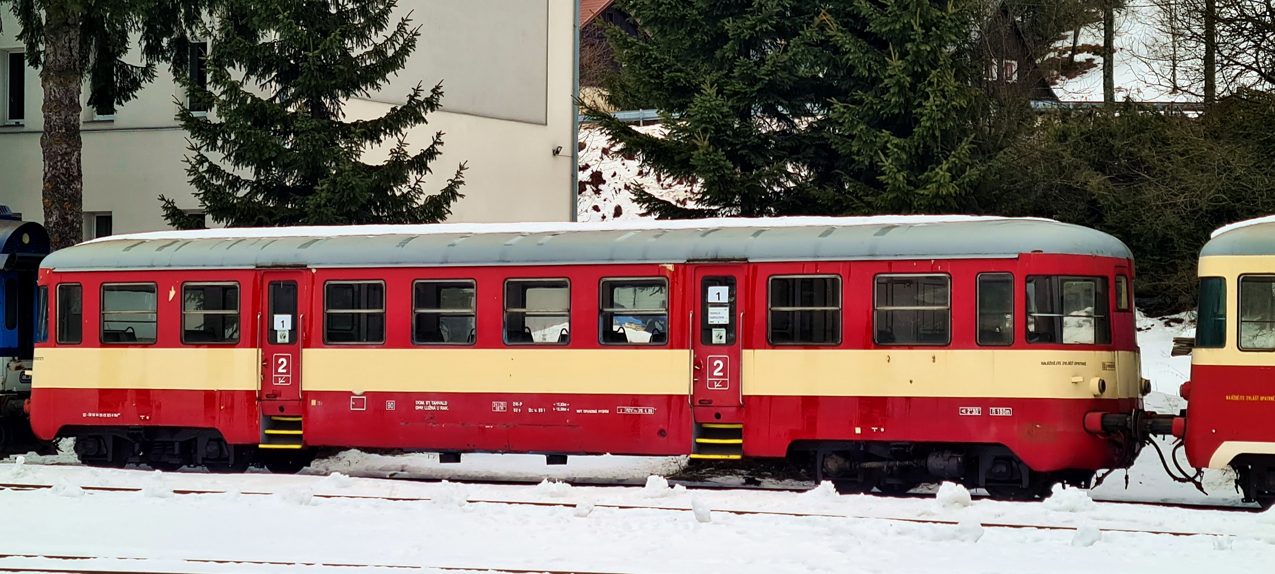 Doczepka serii 020 w składzie z motorakiem 854 225-0 i drugą doczepą , zimująca na skrajnie północnym torze stacji. (Kořenov, 2026-02-05) |